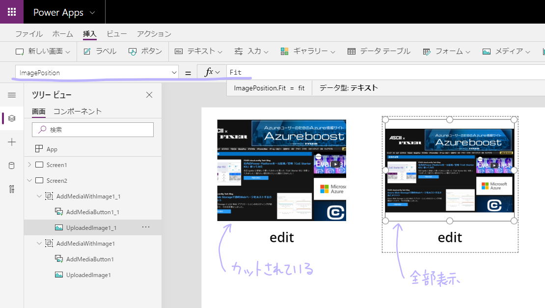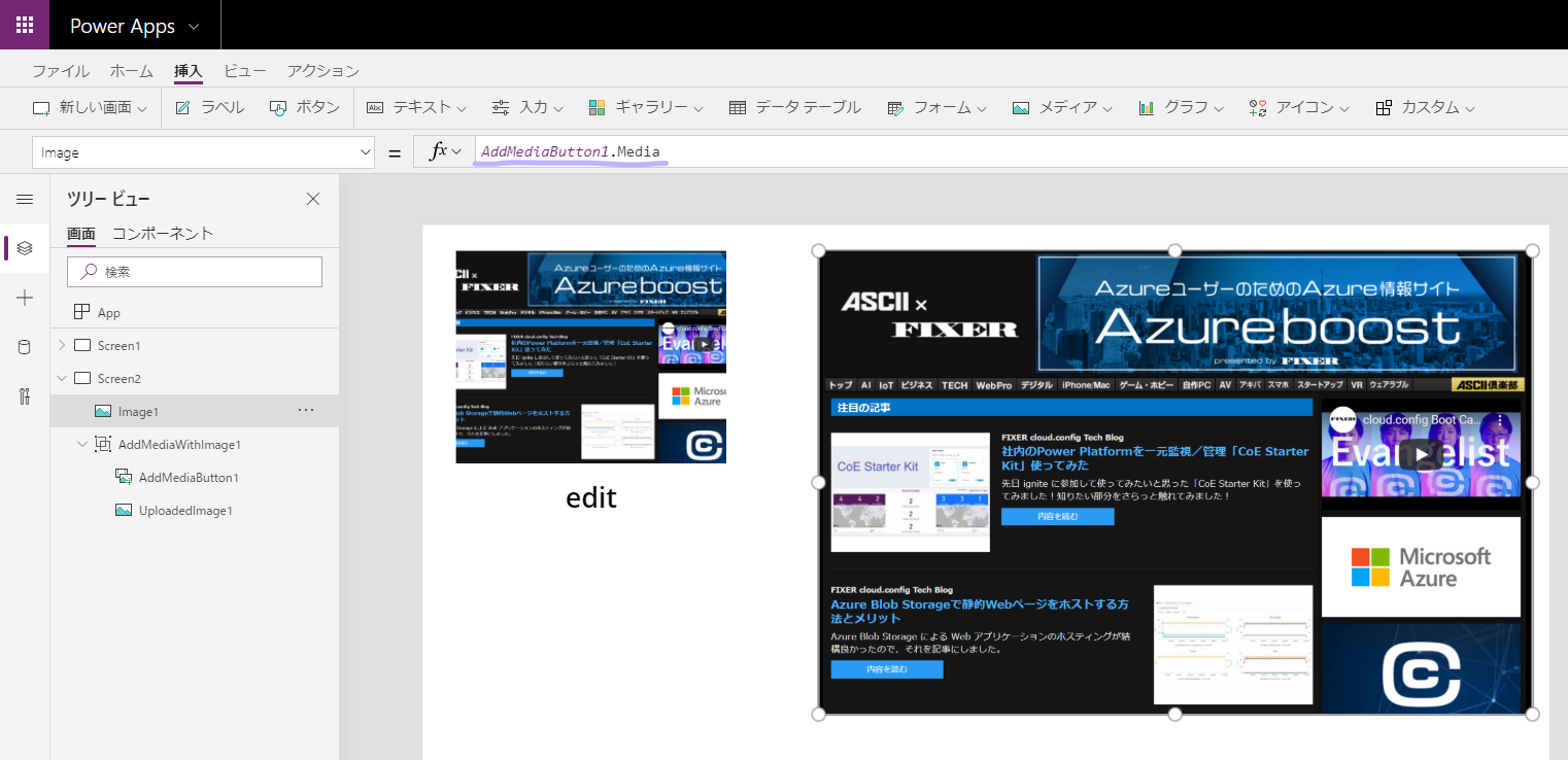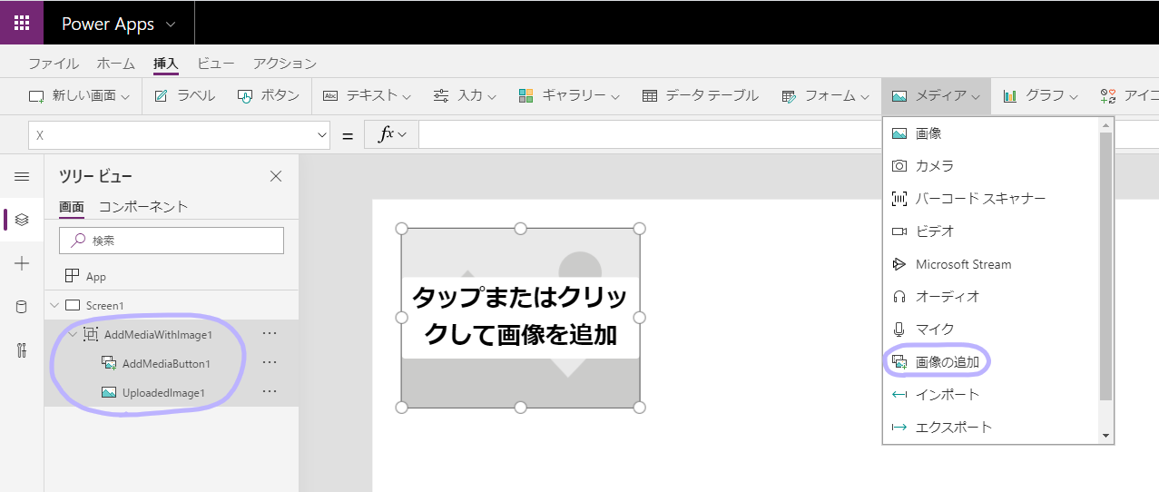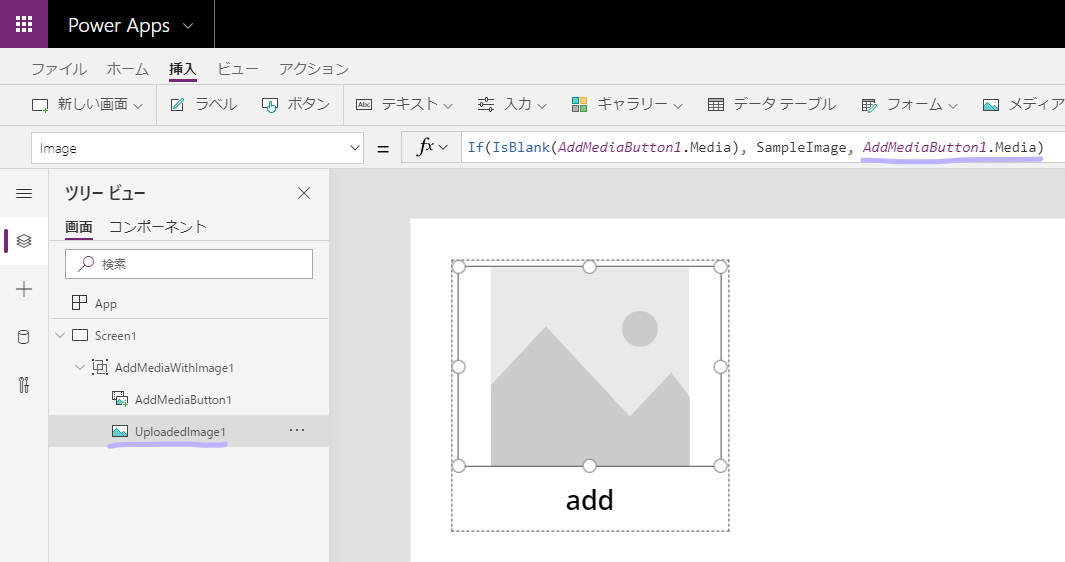 まず「画像の追加」の機能ですが、フォルダやカメラから画像を取得することができます。Power Apps で追加してみると「UploadedImage」と「AddMediaButton」のオブジェクトが入った「AddMediaWithImage」というグループが作成されます。