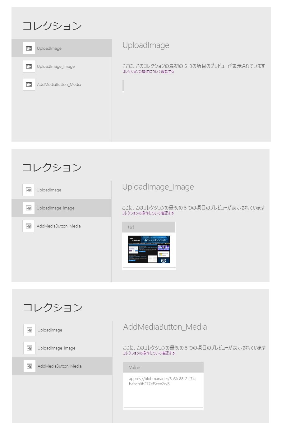 Collection(”コレクション名”, ”画像”) で保持できます。”画像”の参照方法は「UploadedImage」「UploadedImage.Image」「AddMediaButton.Media」の3通りあります。それぞれの参照方法で Collection の中身が変わってくるので、その違いを見ていきます。因みにコレクションの確認は「ファイル」→「コレクション」から確認できます。