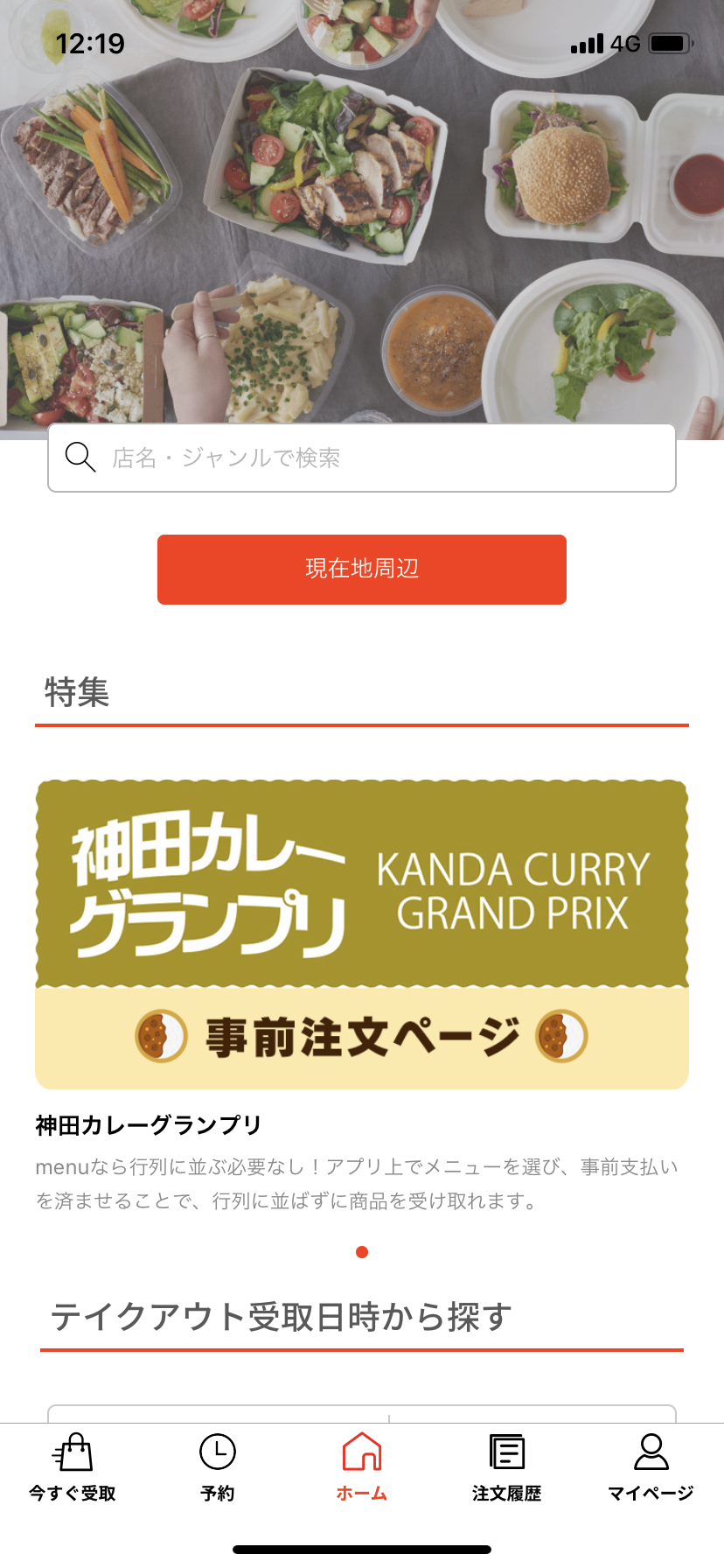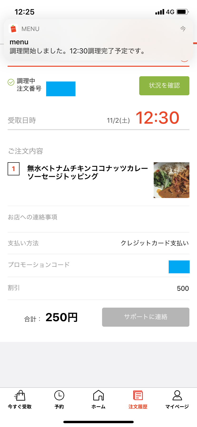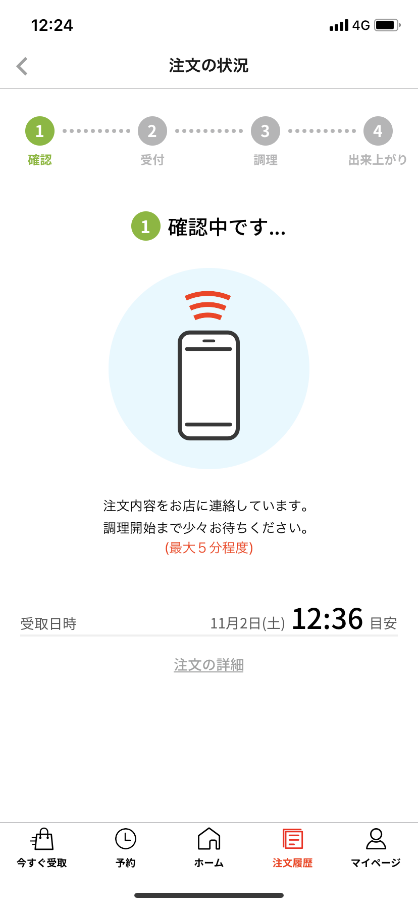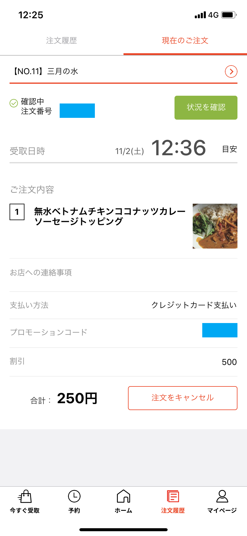 ホーム画面から現在の注文を確認することができ、先ほどの注文状況の確認もこのページからすることができます。