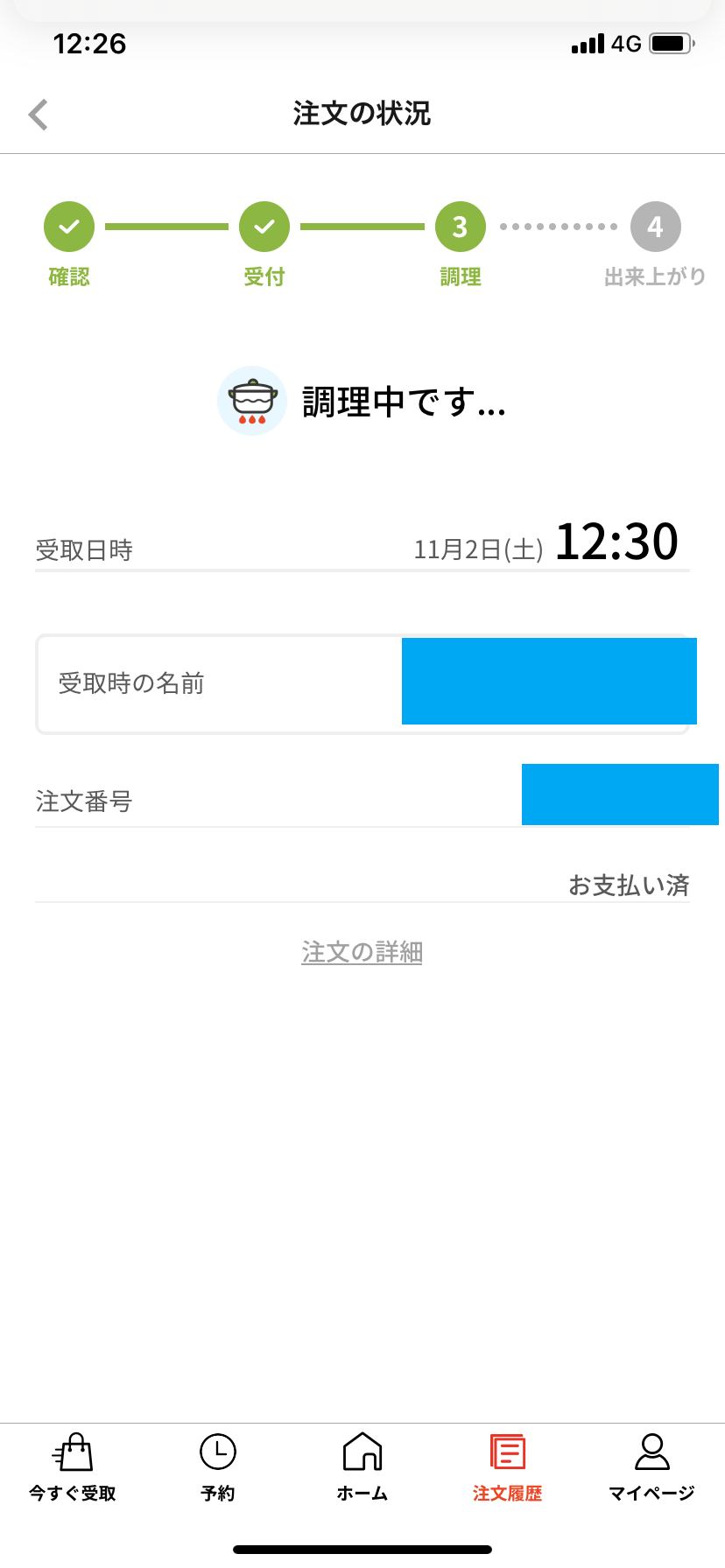 調理中の状況画面はこのようになっていて、受取日時が表示されます。