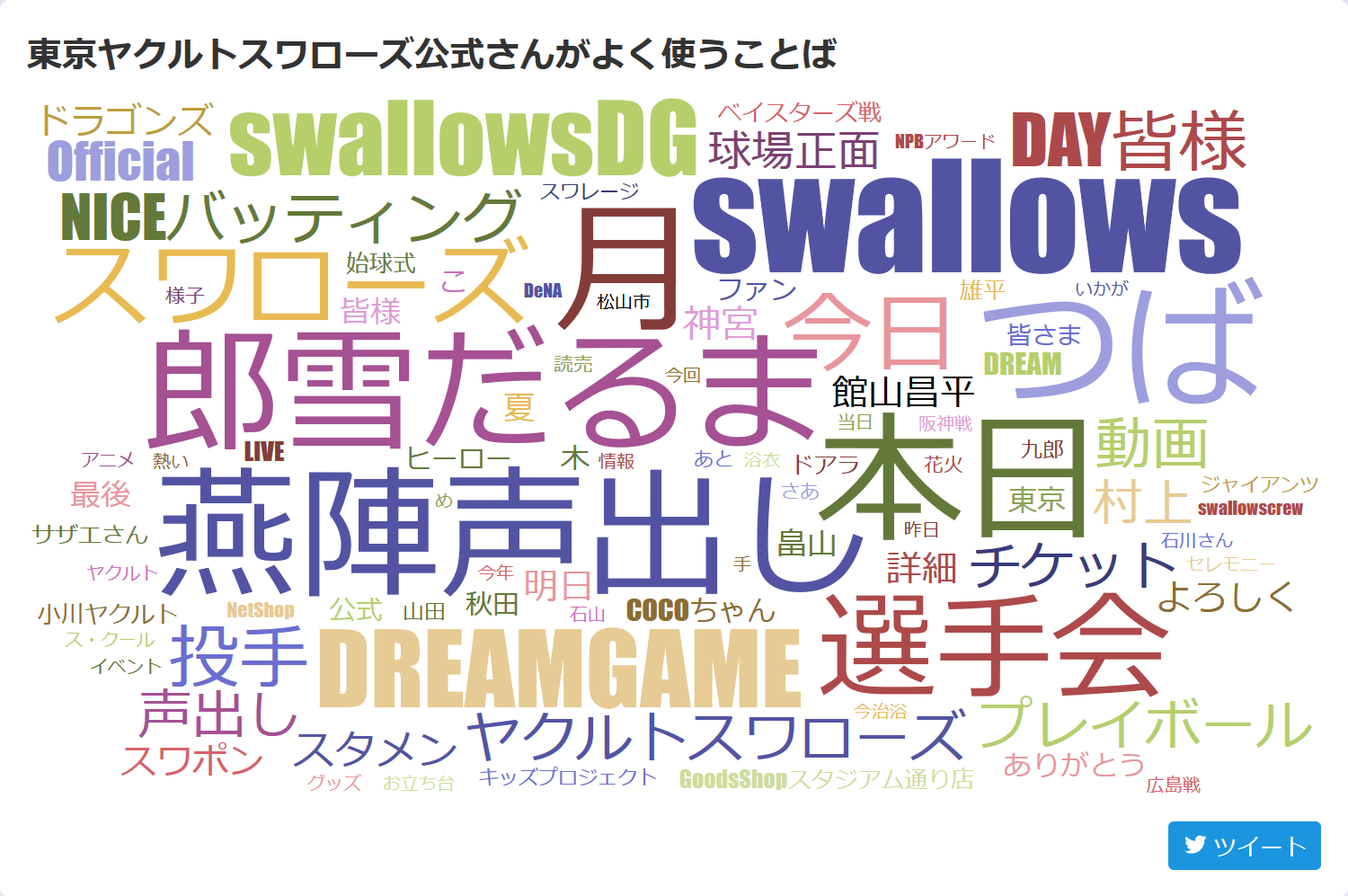 下記はヤクルトスワローズの公式ツイッターとサンケイスポーツヤクルトのツイートを whotwi でワードクラウド化した画像になります。