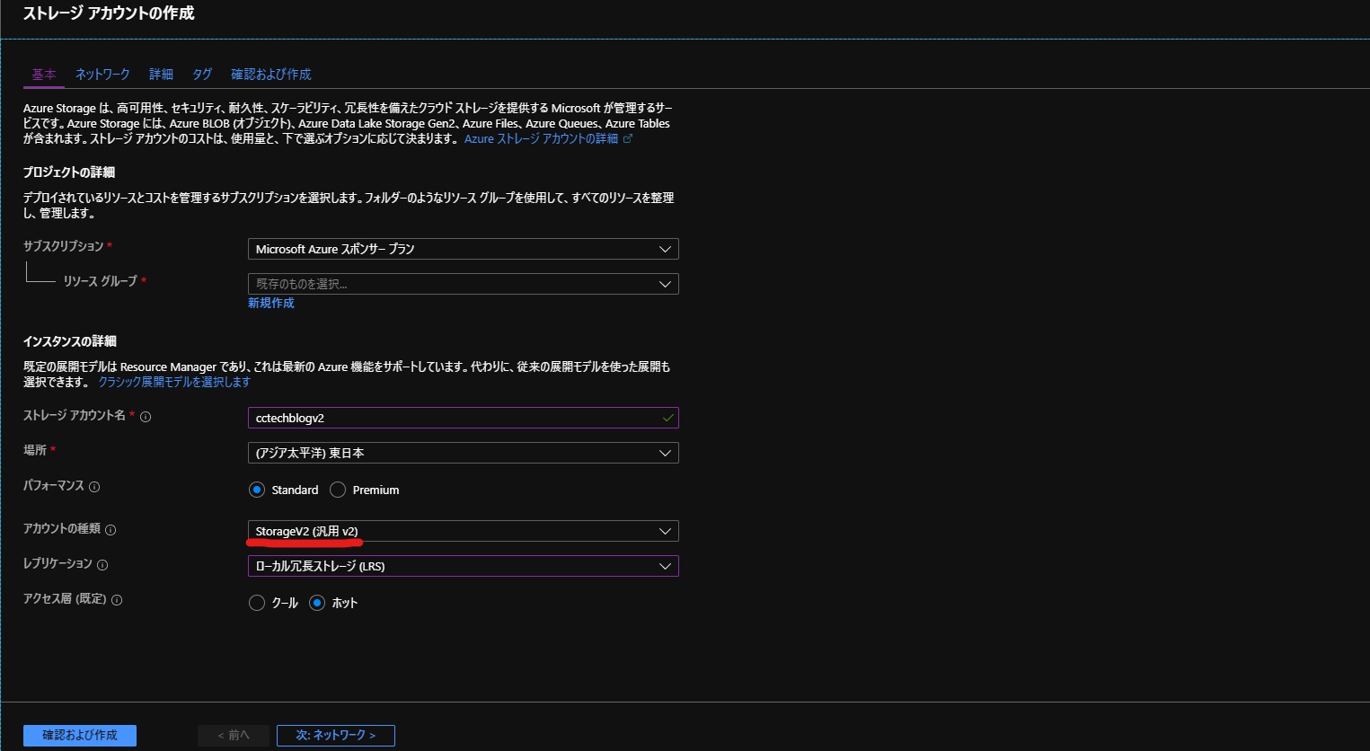 まずはAzure Portalからストレージアカウントを作成します。このときに気を付けることはストレージアカウントを作成する際にアカウントの種類を StorageV2(汎用 v2)にすることです。でないとホスト出来ません。