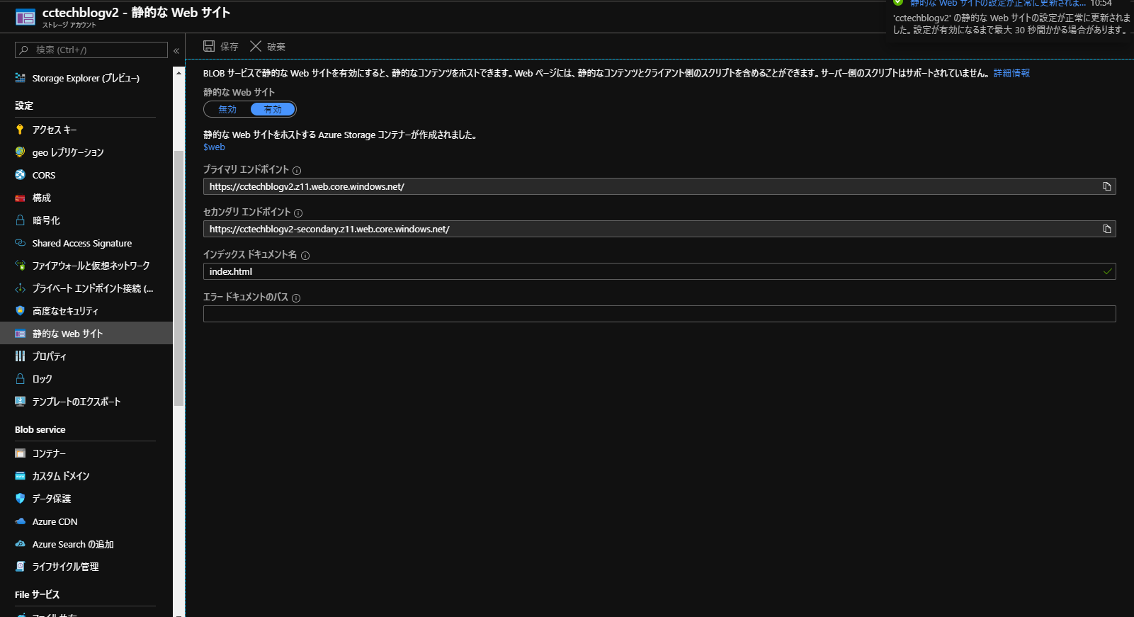 さて、ストレージアカウントの作成が完了したら作成したリソースに移動します。するとストレージアカウントの設定に「静的な Web サイト」という項目があるので、有効にしてインデックス ドキュメント名を設定します。