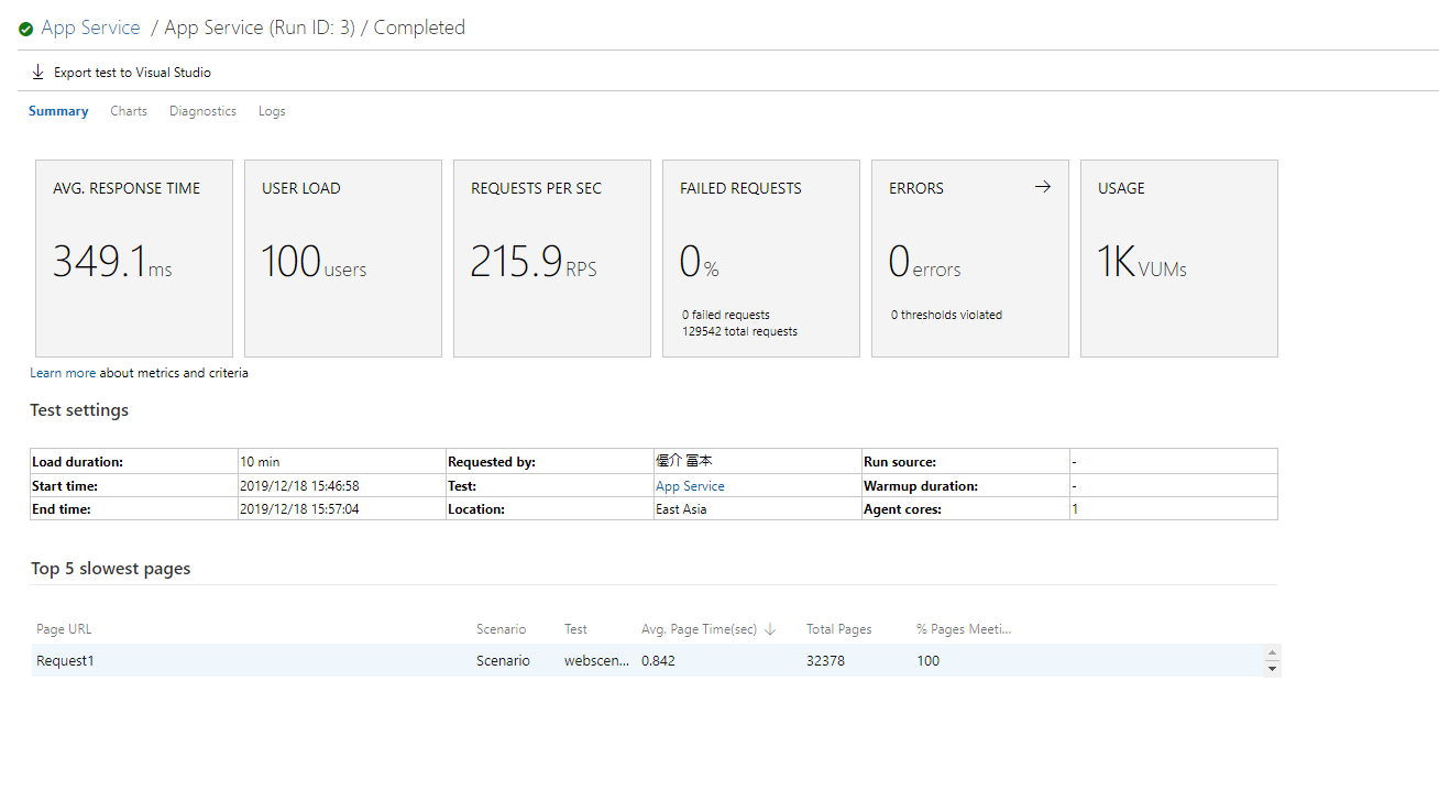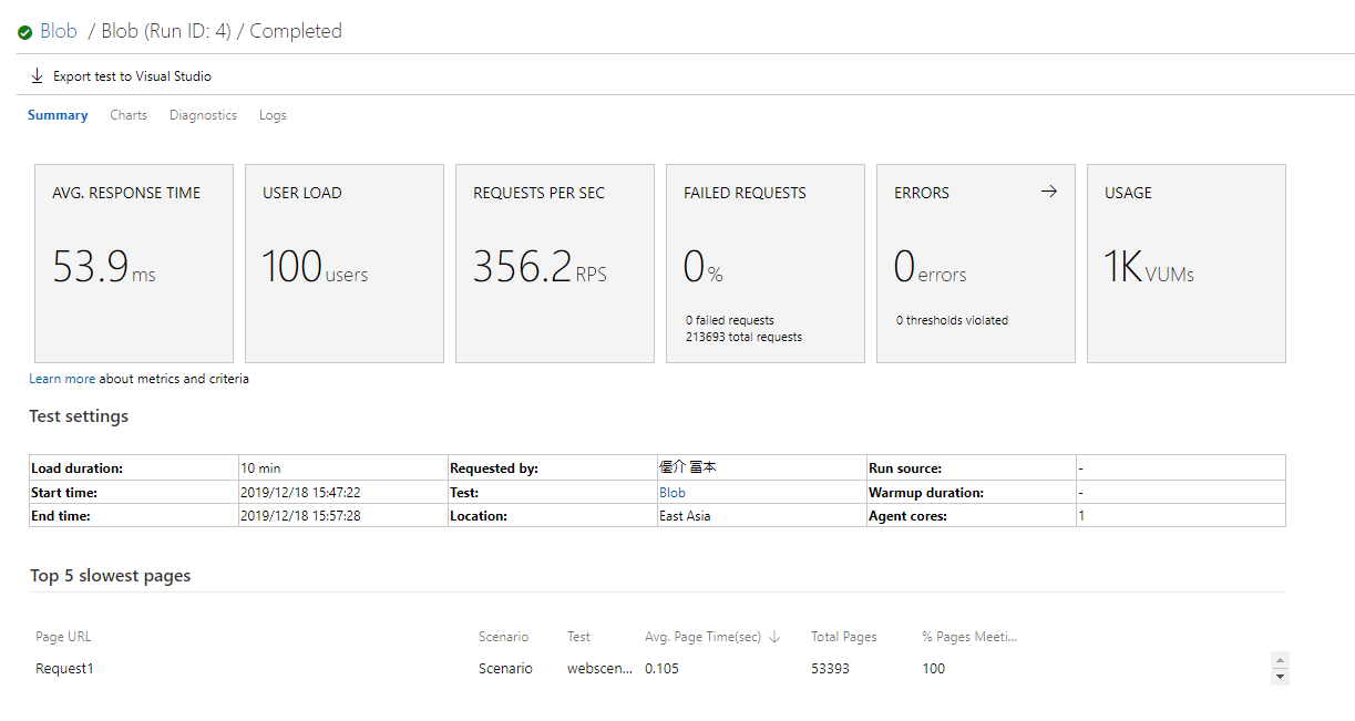 Blob Storage の方が AVG. RESPONSE TIME が結構早いですね。Blob Storage だからといって性能が劣るわけではなさそうです。