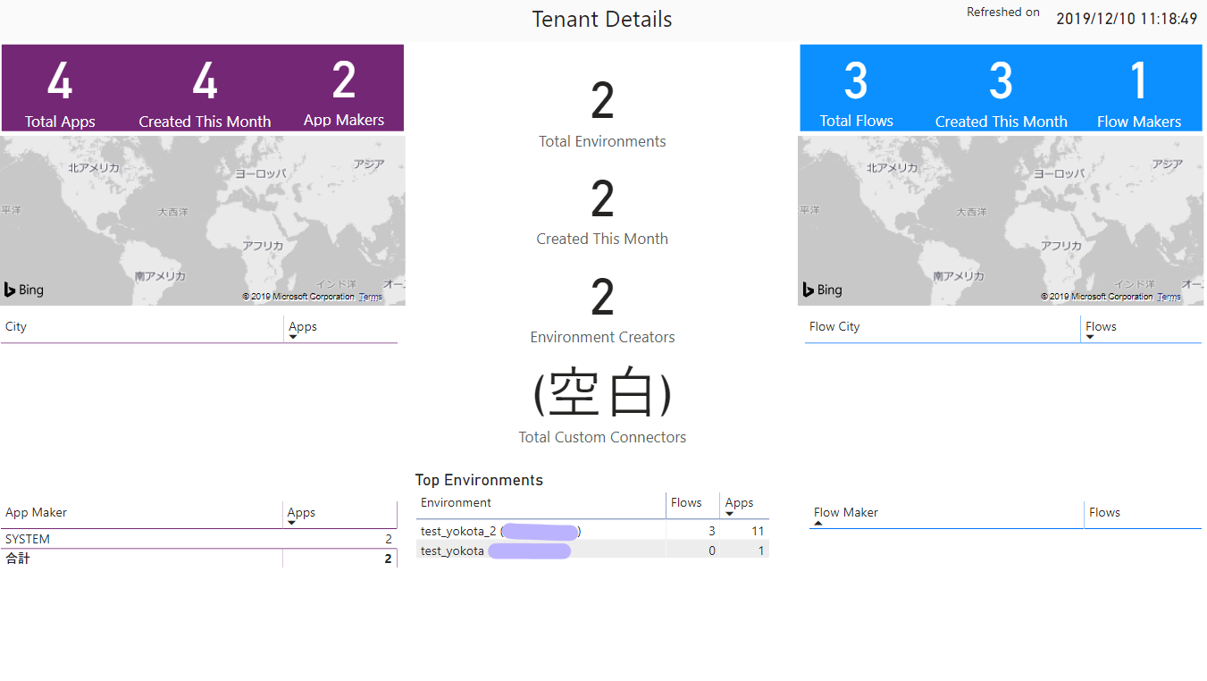 これは Power BI から見れるダッシュボードで、テナント全体の状況が見れます!今までは、環境ごとの管理センターで状況が見れていたそうです。本当はマップにアクティブな地域が表示されるのですが、今回は何もないので表示がありません。左下や右下のMakerにはAppやFlowを沢山作った人がランキング的に確認できます。環境やユーザー数が多い会社は、このダッシュボードからまとめて確認できるのはありがたいはずです!