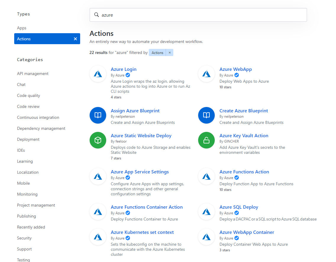 Actionsのページにアクセスして、「azure」と検索すると22個ヒットしました。