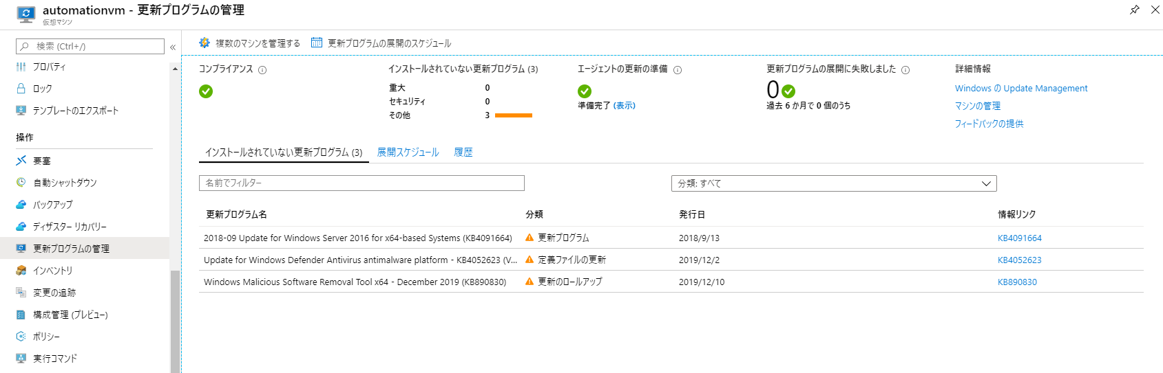 有効化後、仮想マシンにエージェントがインストールされ、不足している更新プログラムが検出されます。取得には時間がかかります。