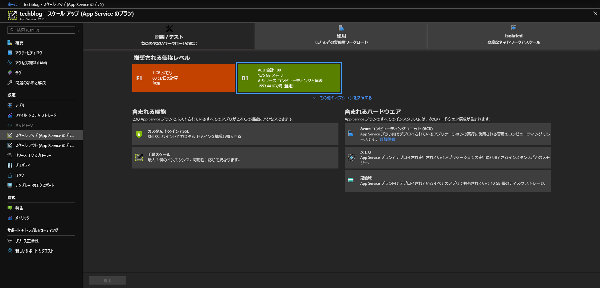 まず、ちょーかっこいいカスタムドメインを取得します。どこから取得してもよいのですが今回は Azure の App Service Plan で取得します。App Service Plan は サイズB1以上からドメインの購入をすることができます。