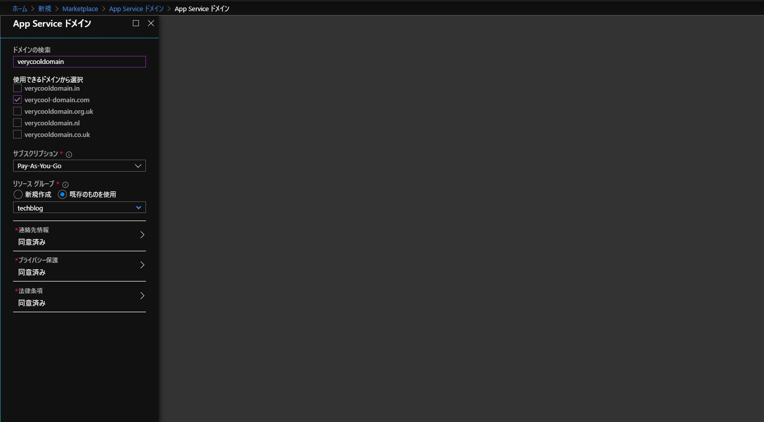 App Service Plan を B1 以上に設定したら App Service ドメインというリソースでカスタムドメインを購入します。ドメインの検索で欲しいドメインを検索すると、購入できる近しいドメインが複数出てくるので、気に入ったものを選択します。