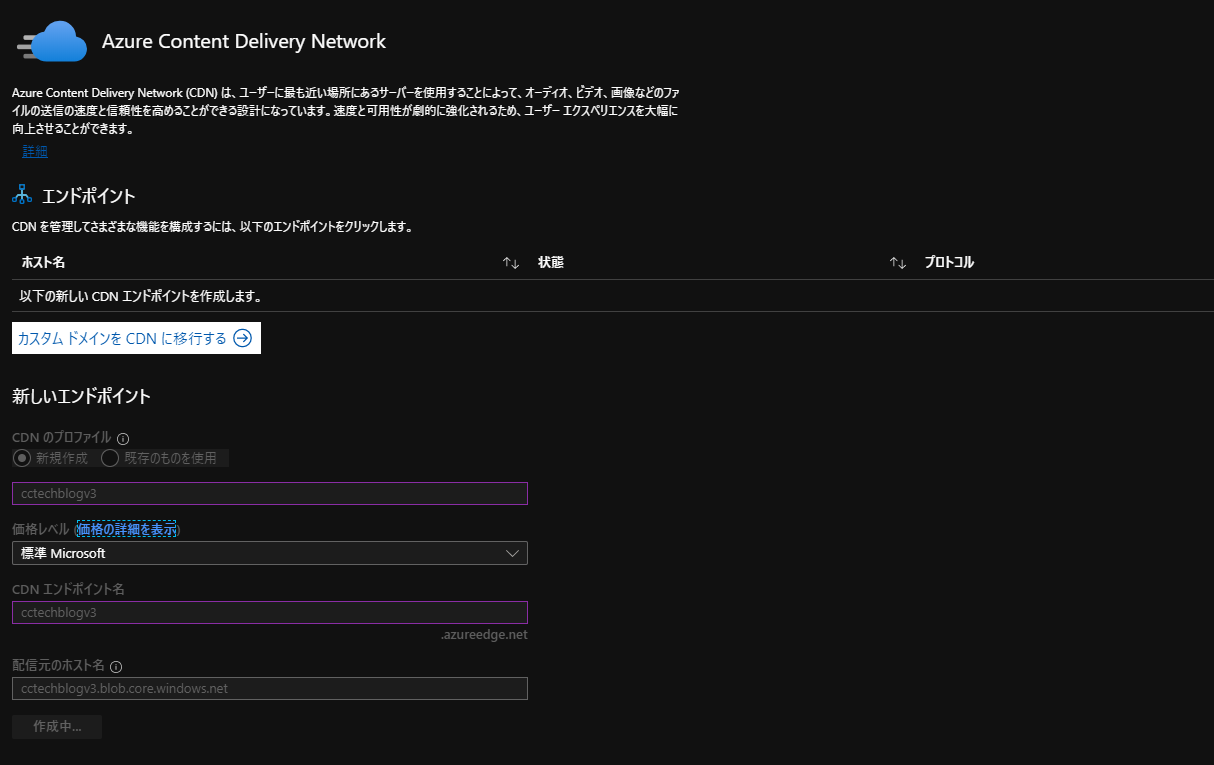 CDNのプロファイルを新規作成で、名前、CDNエンドポイントを任意で設定します。価格レベルはいくつかありますが、動的配信などはしないので今回は「標準 Microsoft」にします。
