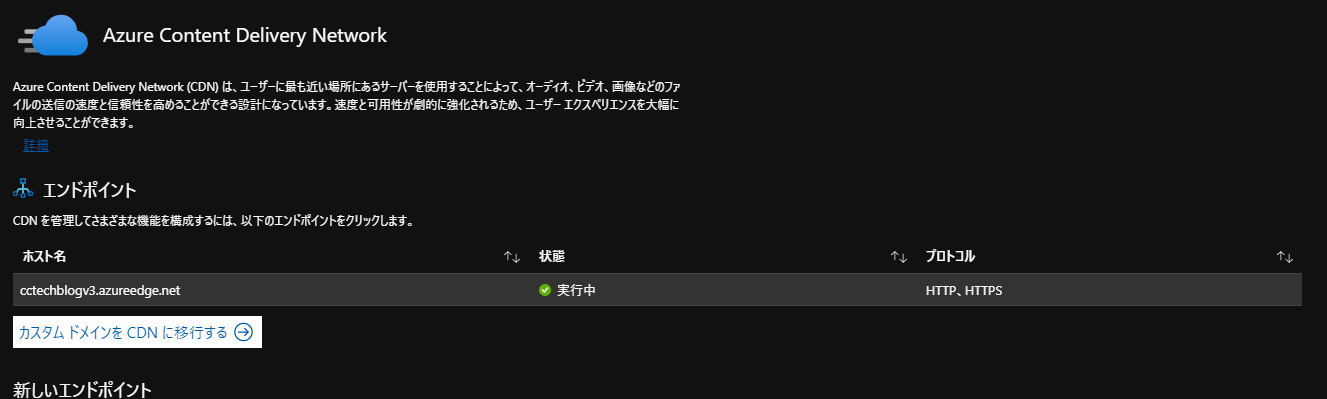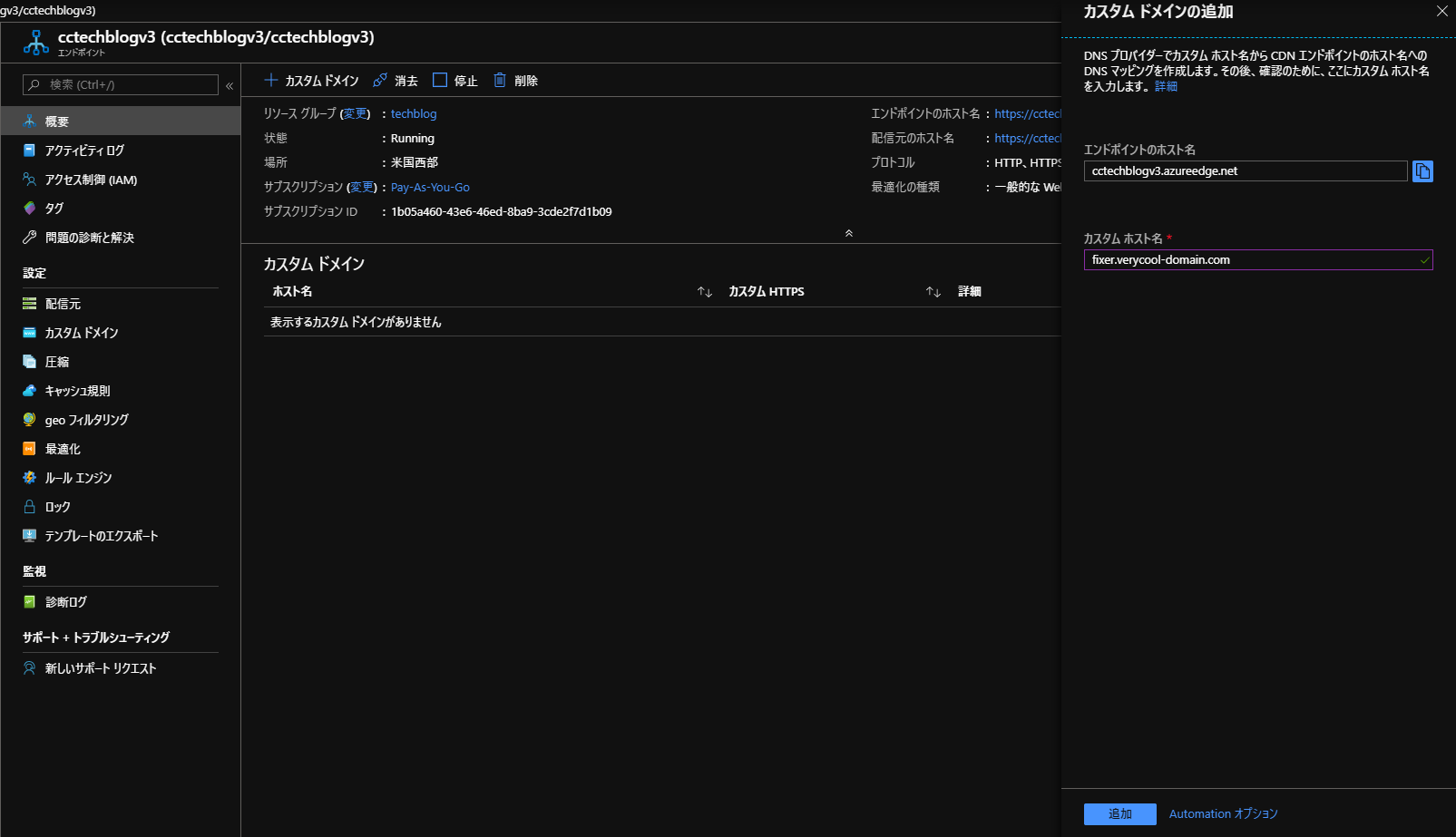 さて、今一度 Azure CDN に戻ってきて今度はカスタムドメインの追加をします。