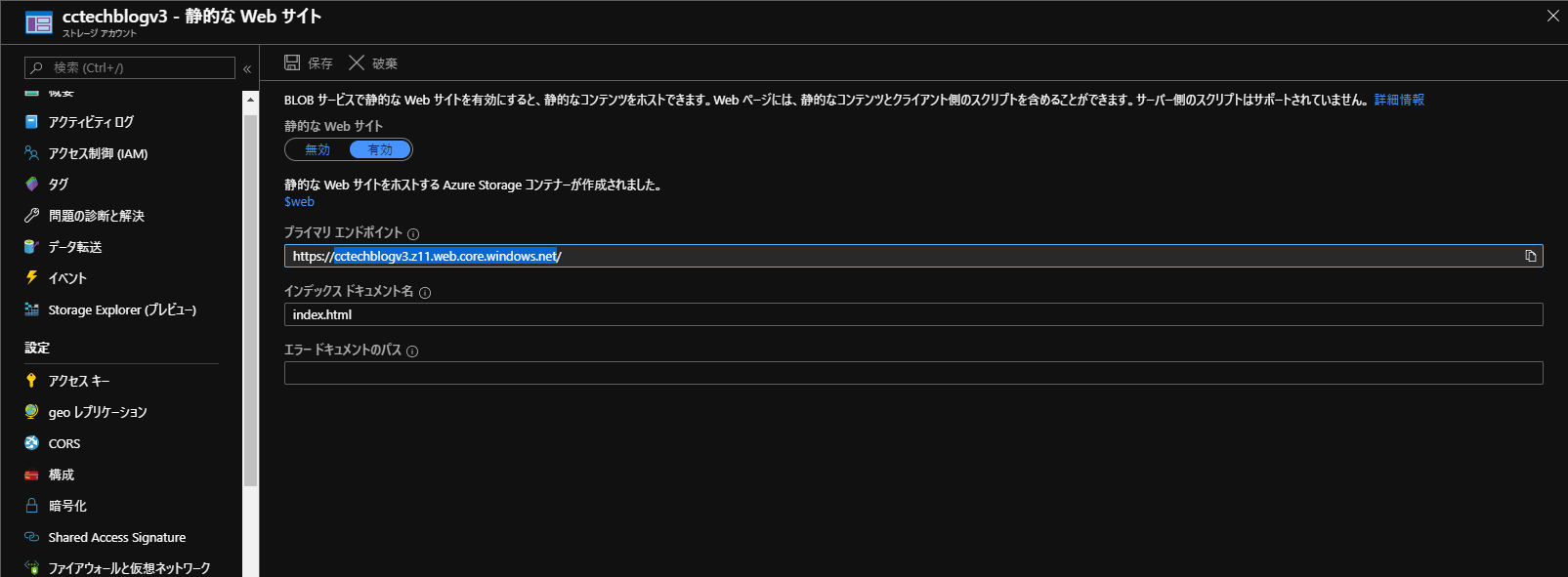 最後に現在の Blob Storage のエンドポイントを Azure CDN の配信元に設定します。まず、Blob Storage の 静的な Web サイトから、プライマリエンドポイントのドメイン名をコピーします。