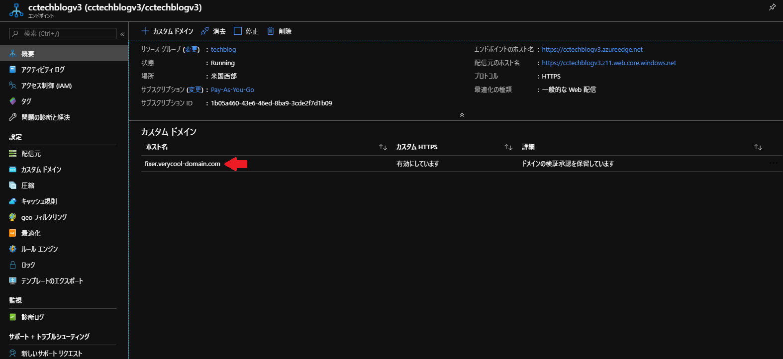 Azure CDNから先ほど追加したカスタムドメインを選択します