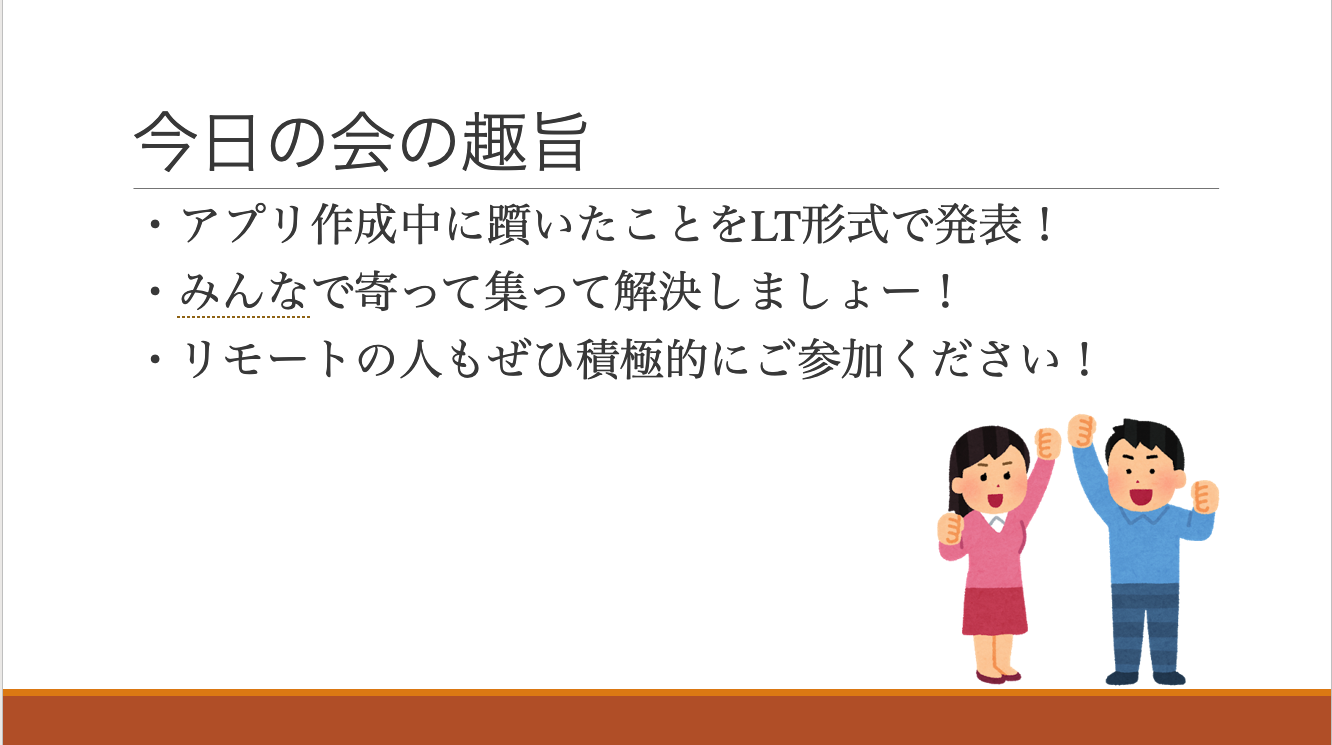 勉強会ではなくて、アプリで詰まったところを紹介してみんなで解決方法を考えようという会で、私は初めて参加するタイプでした。
