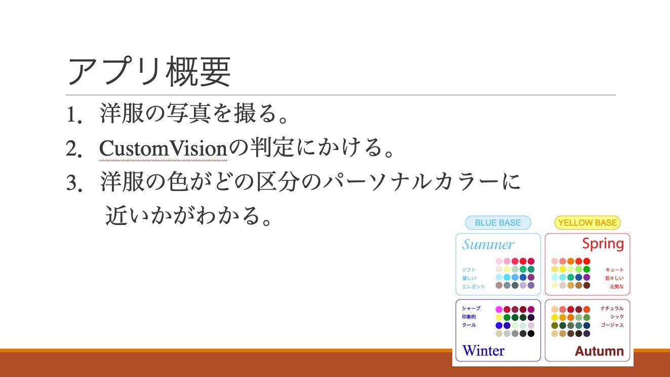 hikariさんが現在作成しているアプリは「洋服の写真から、その洋服がどのパーソナルカラーの服なのかを予測するアプリ」出そうで、以下のように紹介されていました。