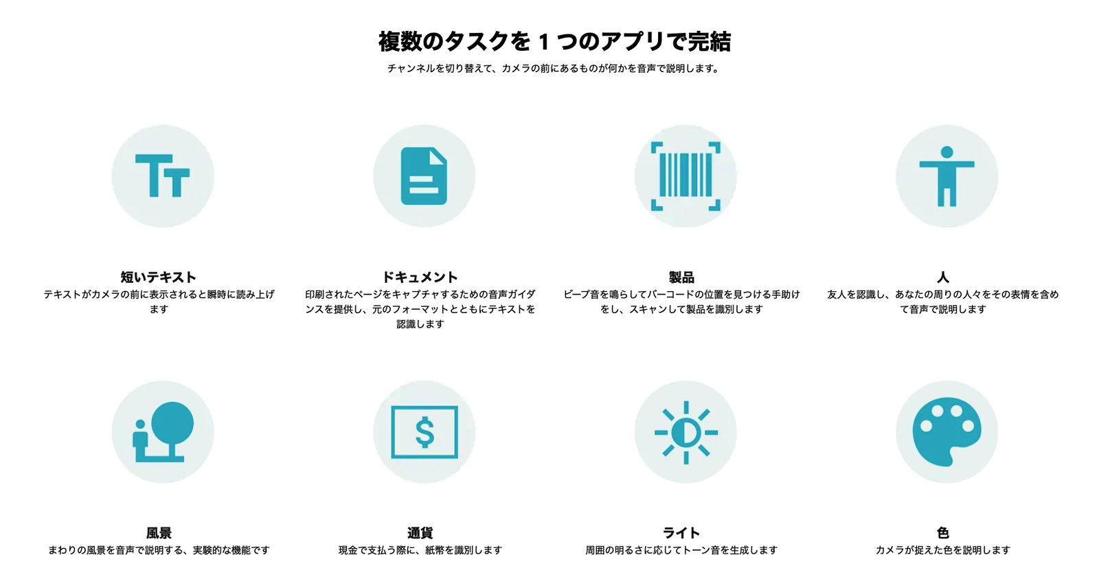 Seeing AIの以下の9つの機能を文字認識系と画像認識系に分けて紹介します。