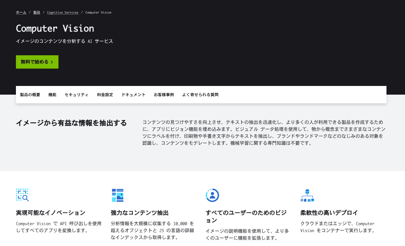 こちらはどちらも紹介ページのデモでみた項目が多いため、Computer Visionの各サービスを利用して実現しているのではないかと考えられます。