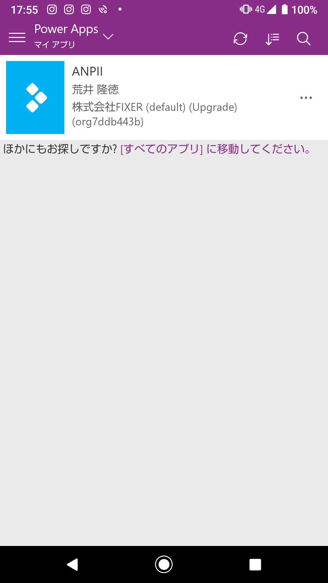 インストールした「PowerApps」アプリを起動するとAzure Active Directory による認証がはいると思います。認証情報を入力しログインすると発行したアプリケーション一覧が表示されます。