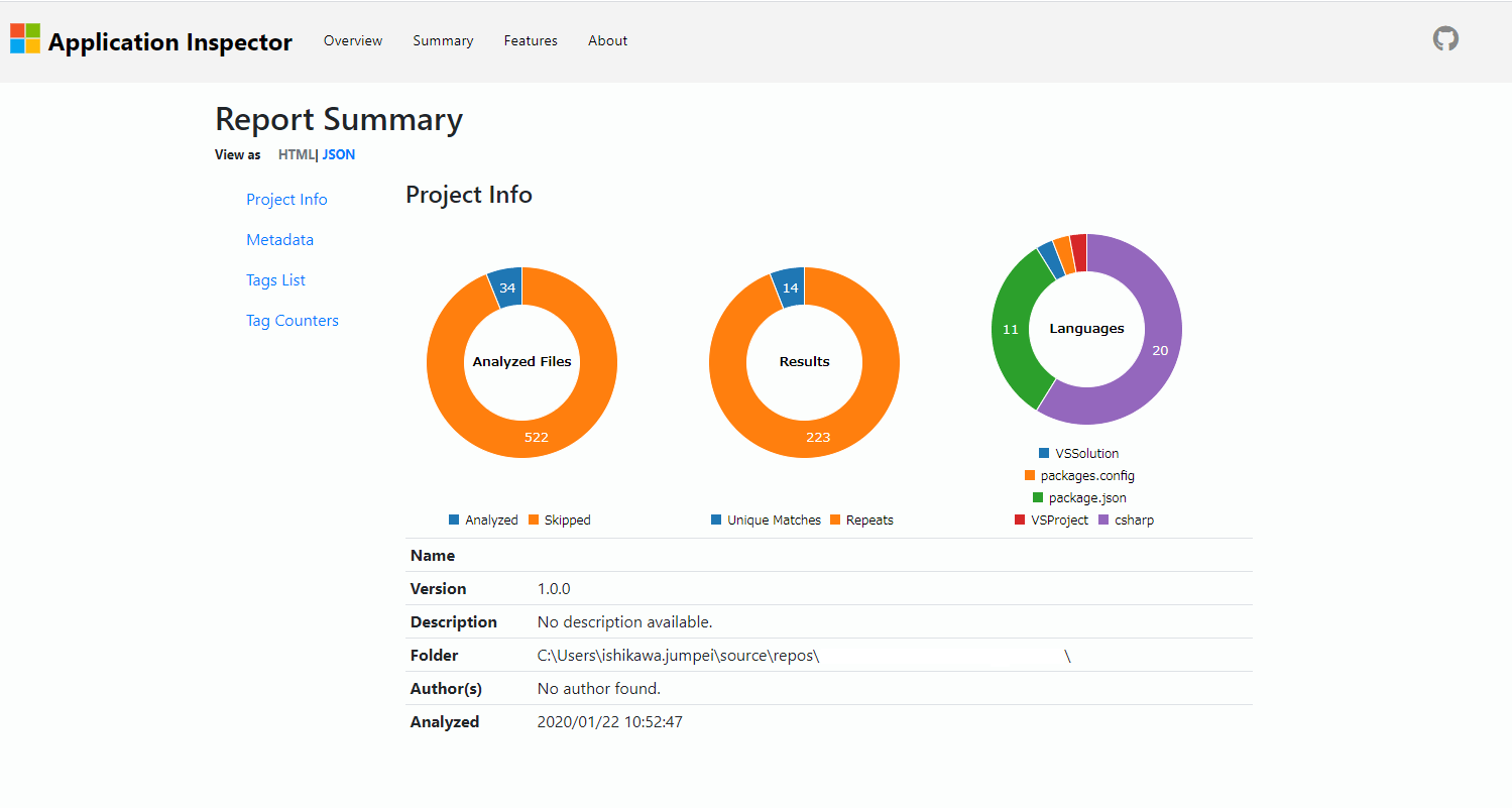 PS C:\Users\ishikawa.jumpei\Documents\App\ApplicationInspector_1.0.21> .\AppInspector.exe analyze -s C:\Users\ishikawa.jumpei\source\repos\*********\