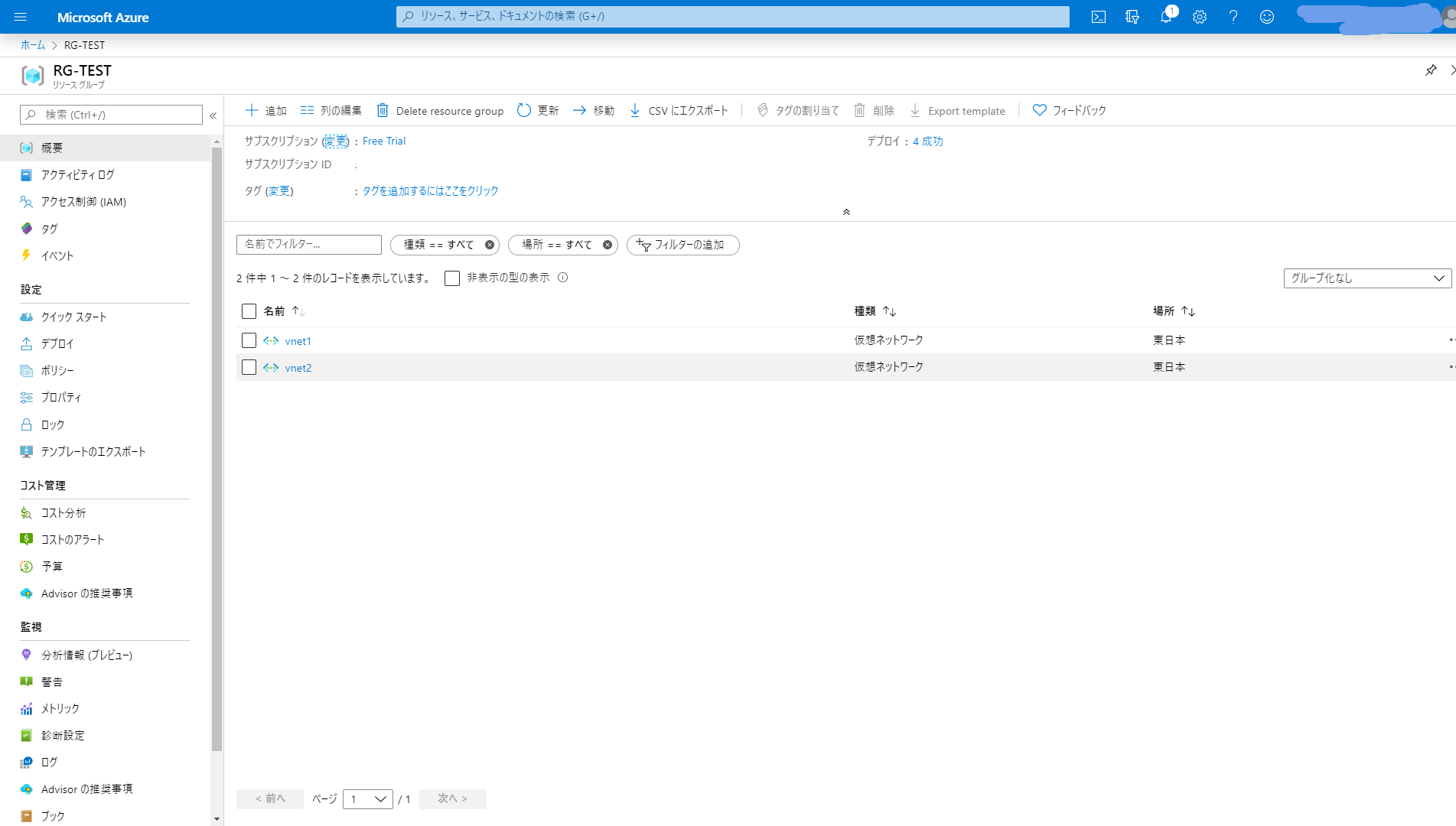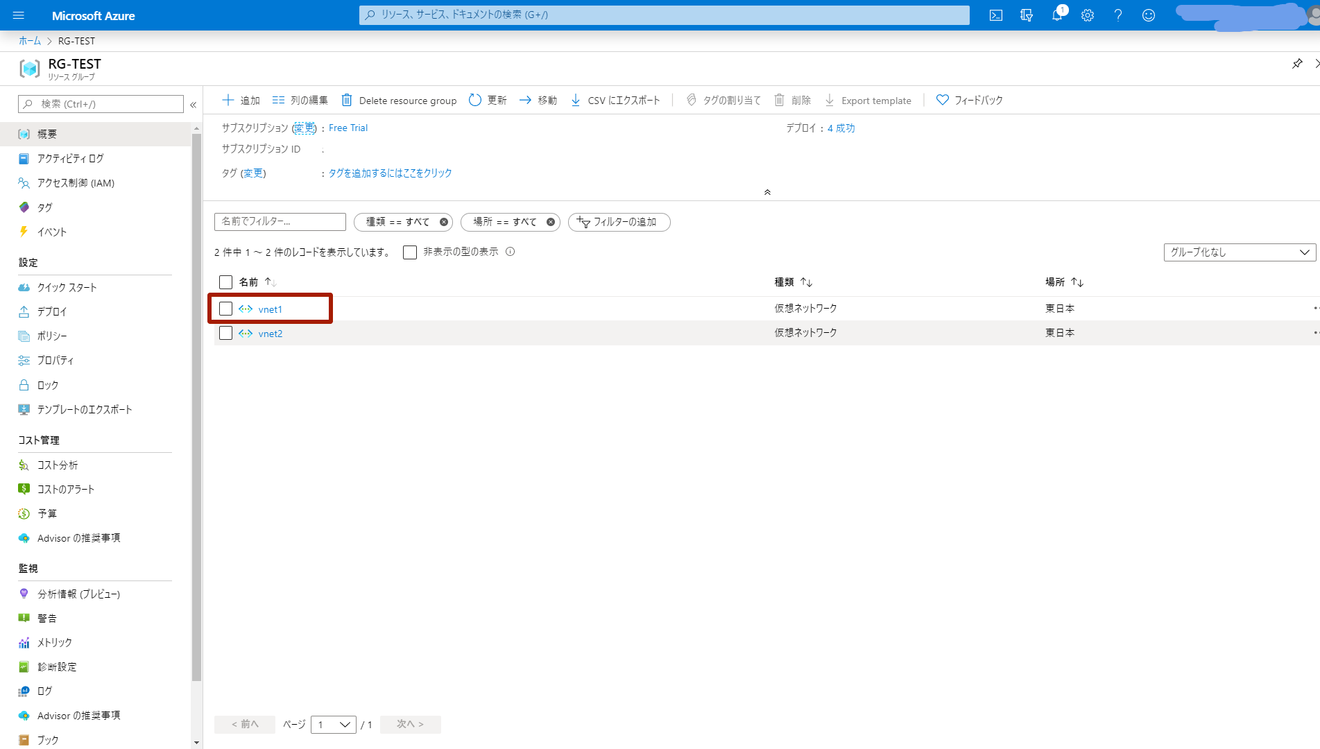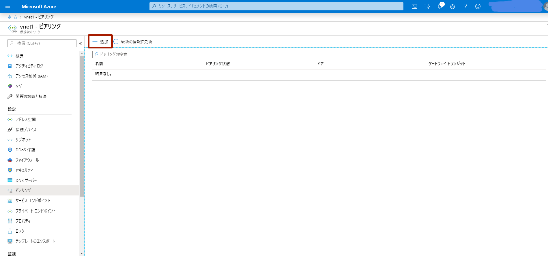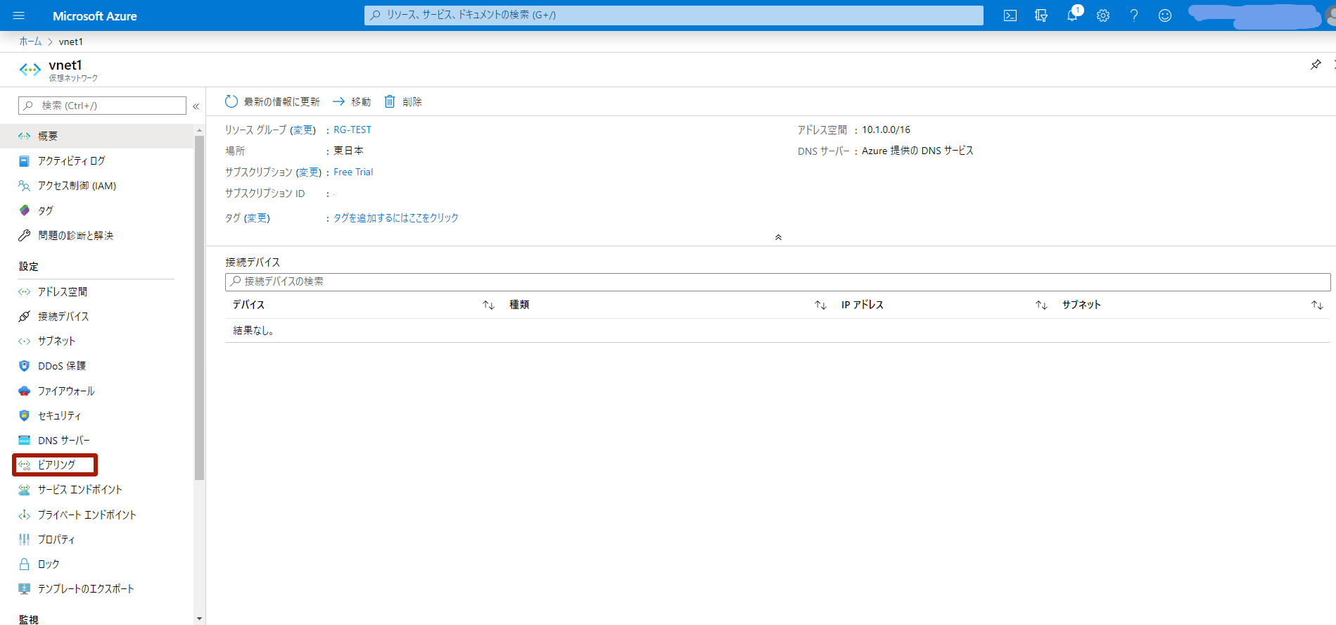 今回はお試しなので、同一サブスクリプション、同一リソースグループ内に作成された仮想ネットワーク同士をピアリングしてみます。