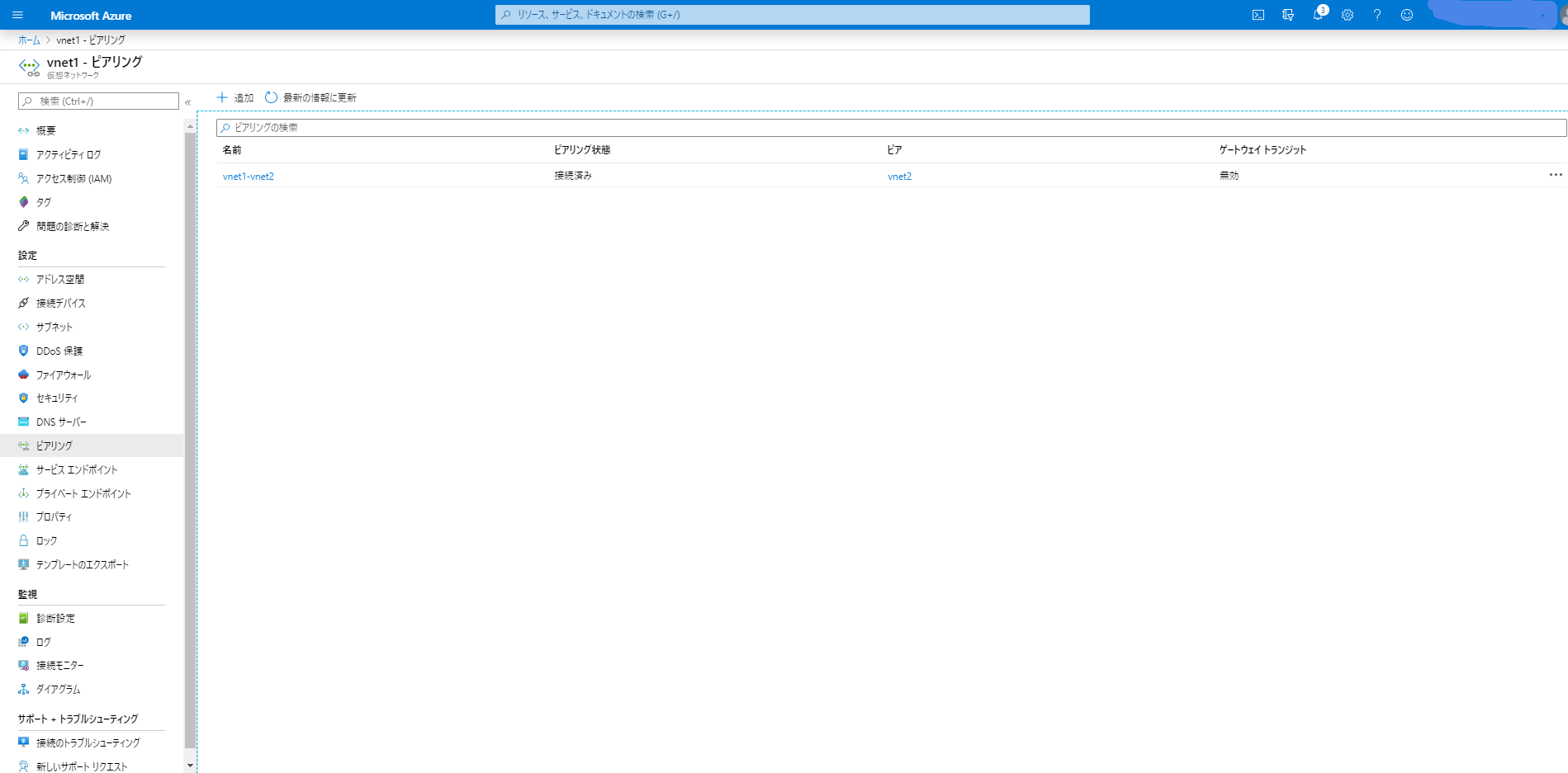 各仮想ネットワークのピアリング設定画面で「ピアリング状態」が「接続済み」になっていれば完了です。とてもかんたん!