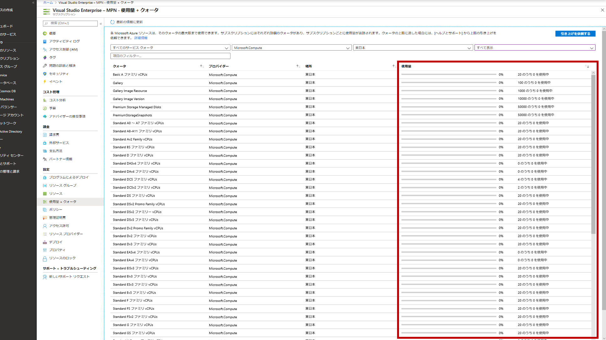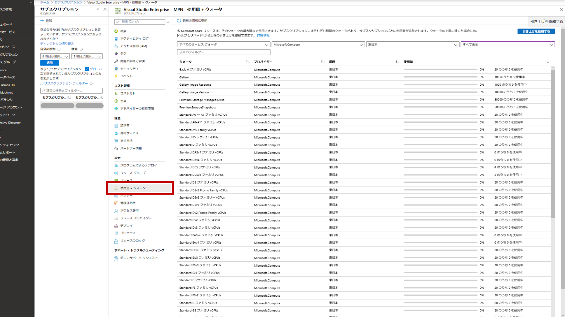 - Azure Portal上で、 [サブスクリプション > 使用量 + クォータ] を開きます。