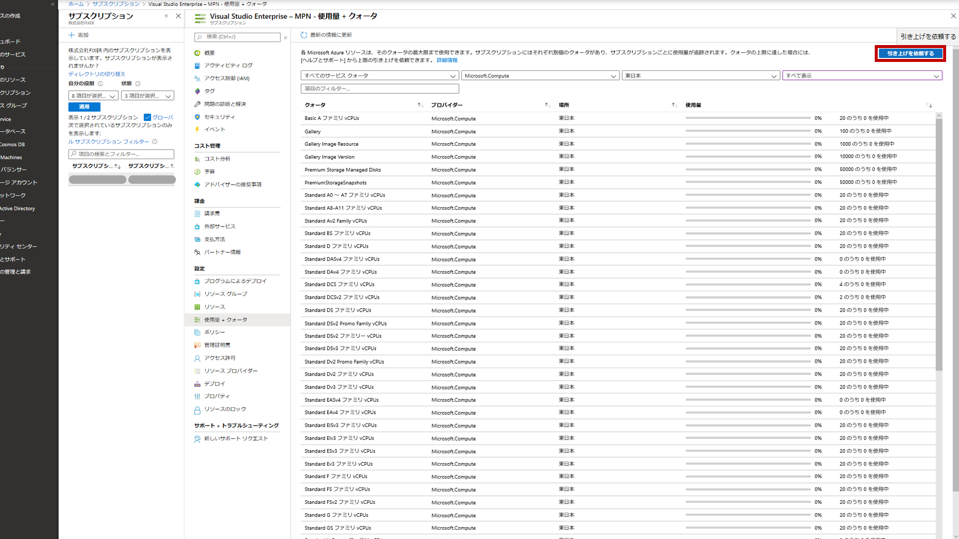 このような際のために、2つ目の方法として、クォータ上限の引き上げを行うことが可能です。 クォータ上限の引き上げは、Azure Portal上の [ヘルプとサポート] か、[サブスクリプション] から行うことが可能です。今回は、[サブスクリプション] からのクォータ上限の引き上げ方法に沿って、手順を説明していきます。