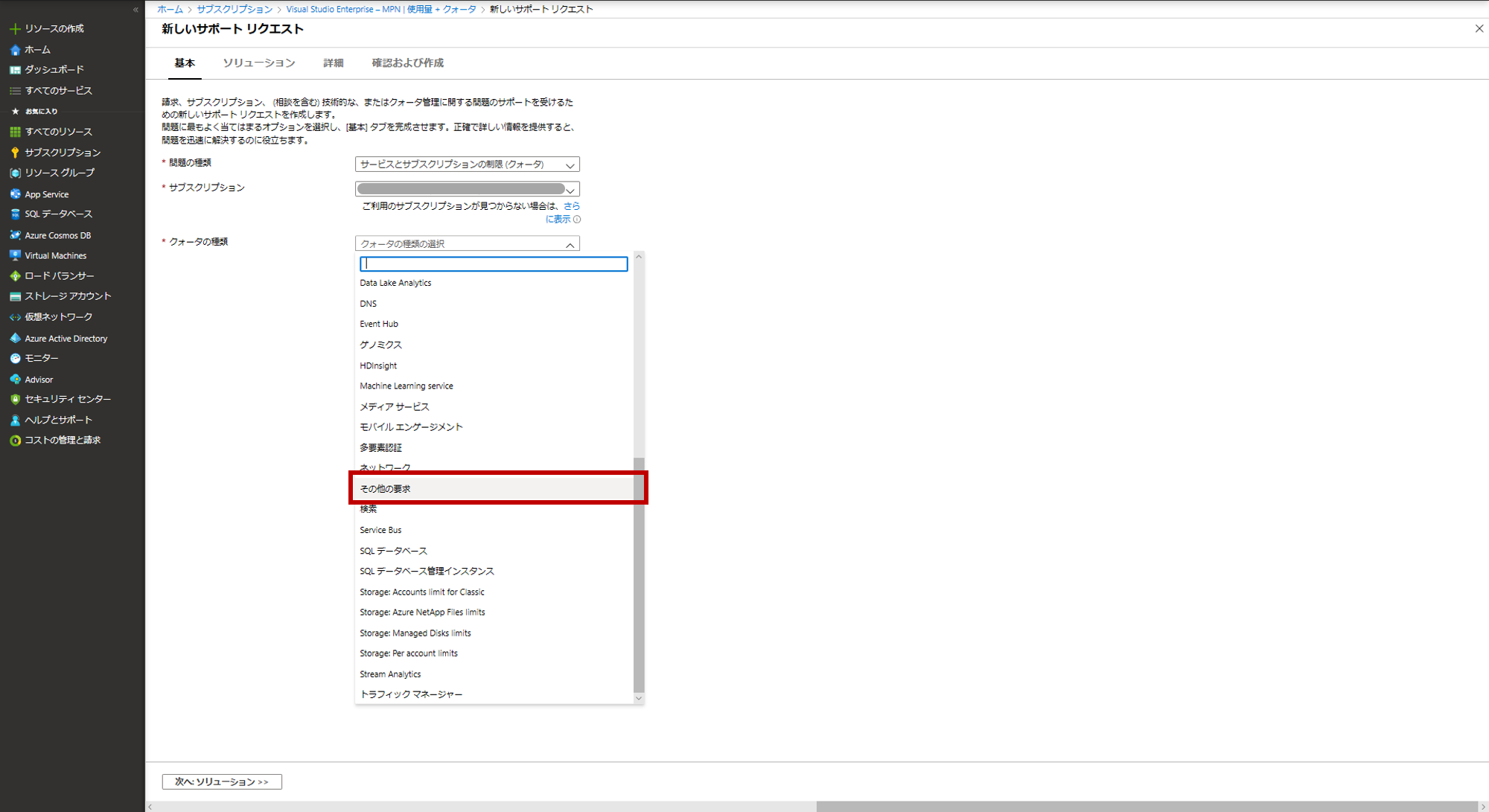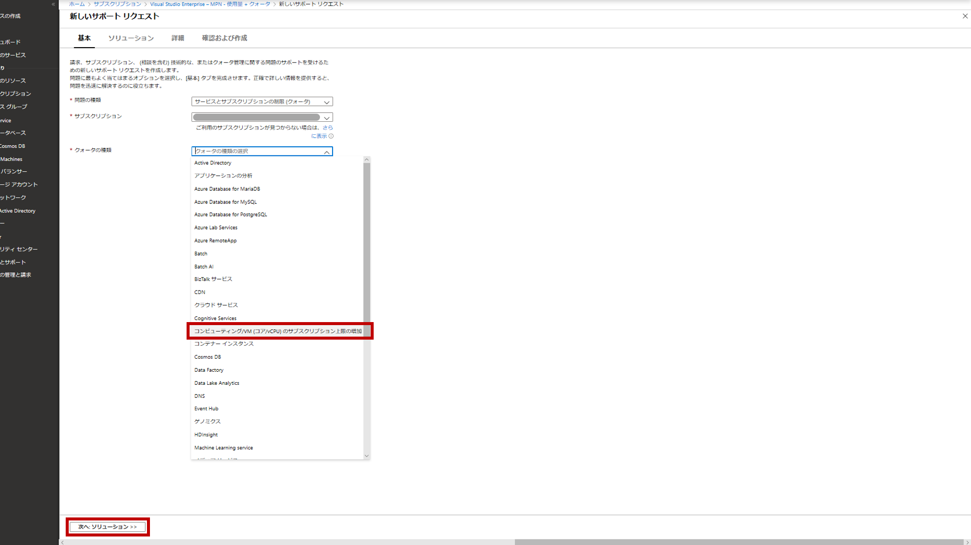 - サポートリクエストの作成画面へ遷移するので、[クォータの種類] を選択し、[次へ: ソリューション] を選択します。