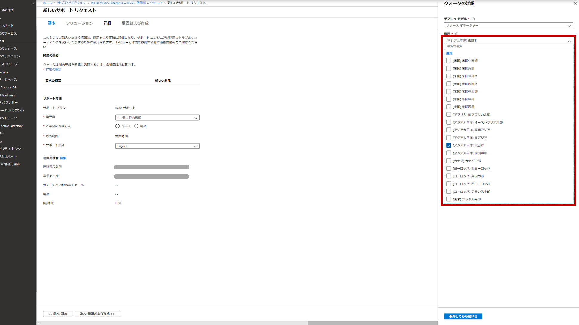 - 場所 からクォータ上限の引き上げを行うリージョンを選択します。