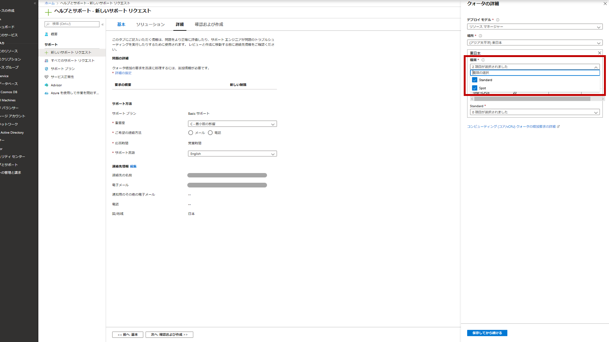 - 種類 から上限の引き上げを行うクォータの種類を選択します。VMシリーズごとのクォータ上限の引き上げを行う場合は Standard、Spot VMのクォータ上限の引き上げを行う場合は Spot を選択します。