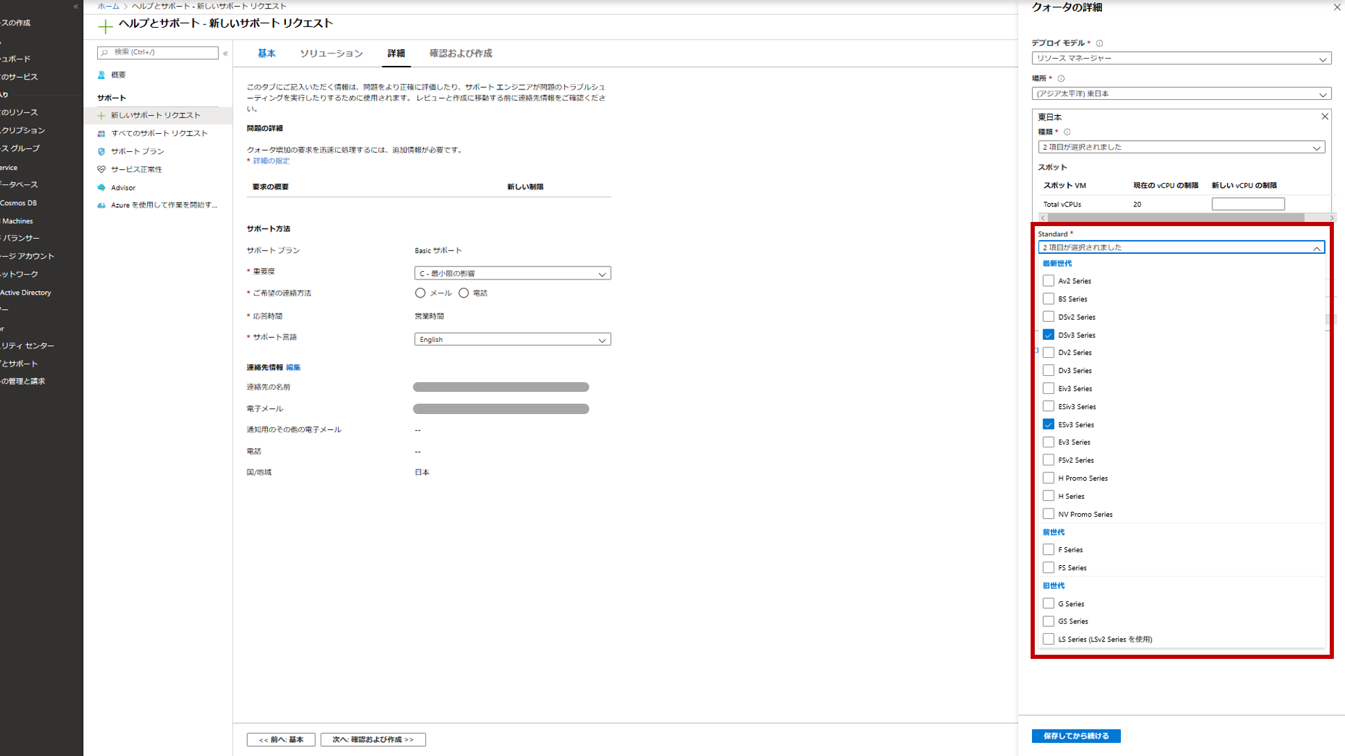 - Standard を選択した場合は、クォータ上限の引き上げを行う VMシリーズを選択します。