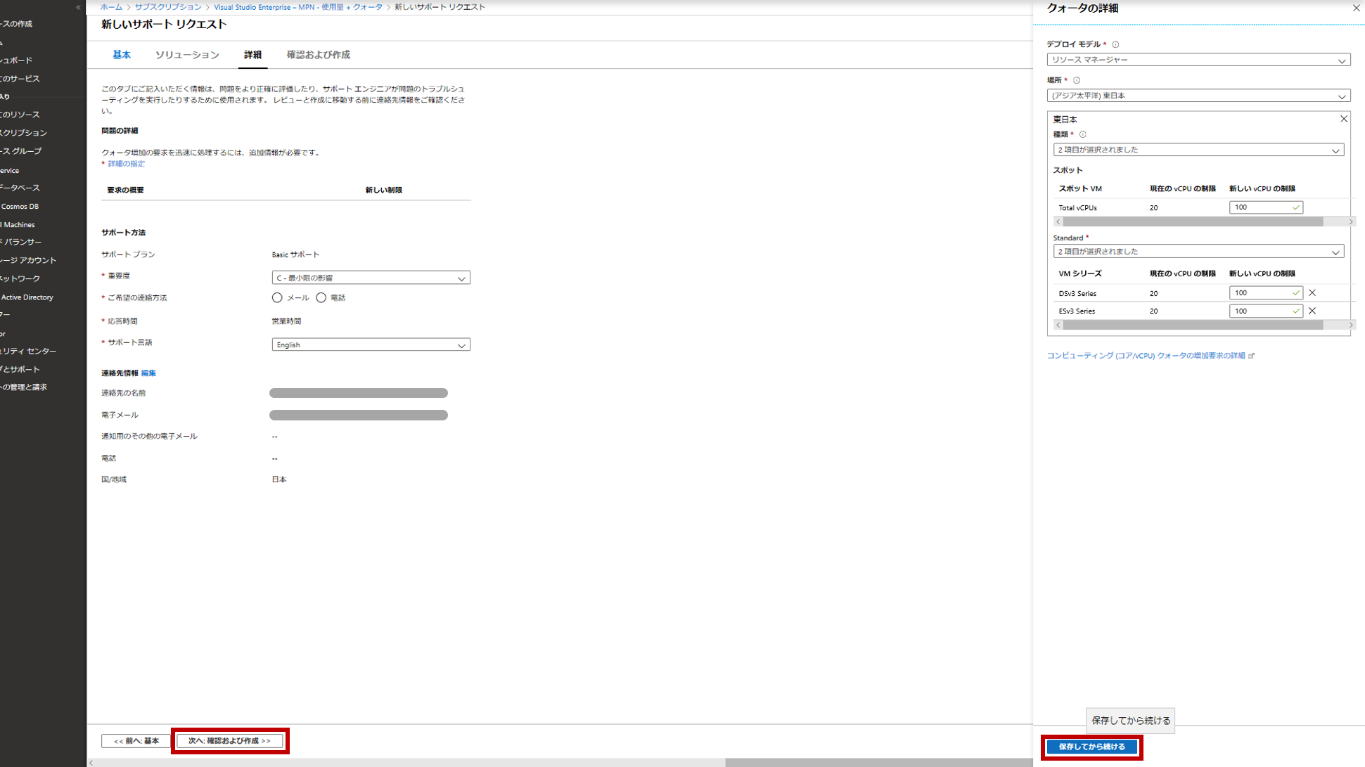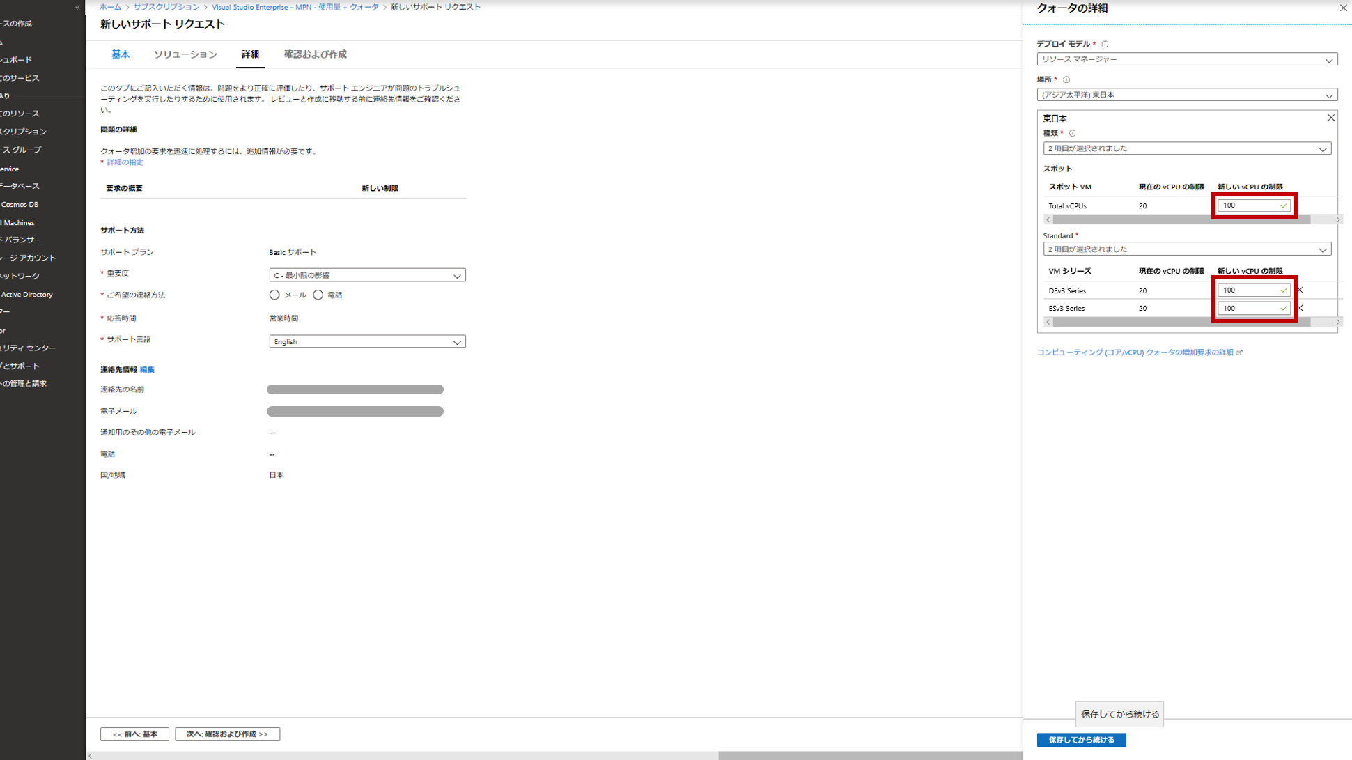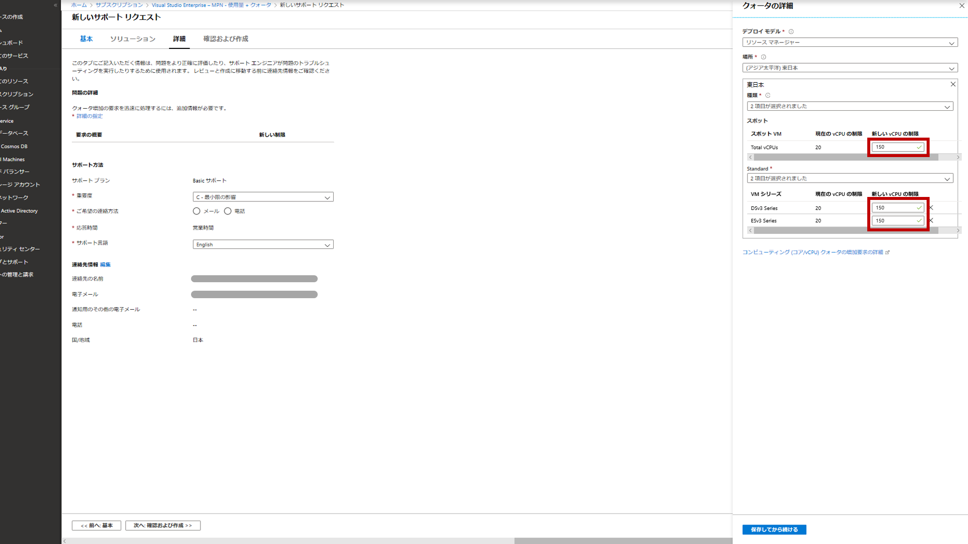 - 引き上げるクォータ上限: リージョン全体のvCPU上限