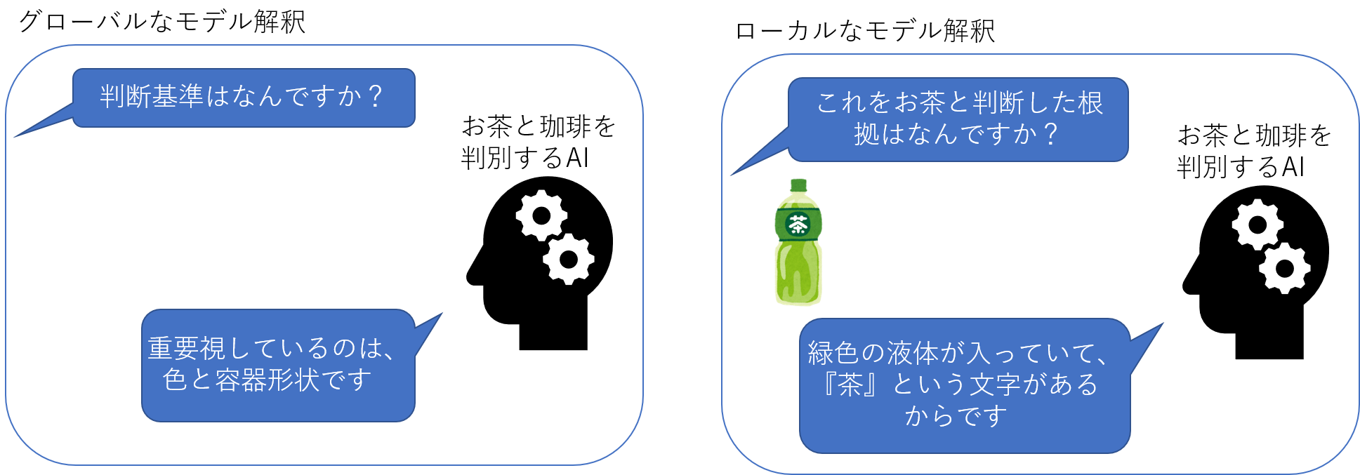「ローカルなモデル解釈」では予測対象のデータを与えられ、それに対してなぜその予測結果になったのかを知ることが出来ます。例えば、画像に写っているものがお茶か珈琲かを判断するモデルにお茶の画像を与えてローカルなモデル解釈を行った場合、お茶と予測した理由を「色が緑だった」「茶という文字があった」などと説明します。