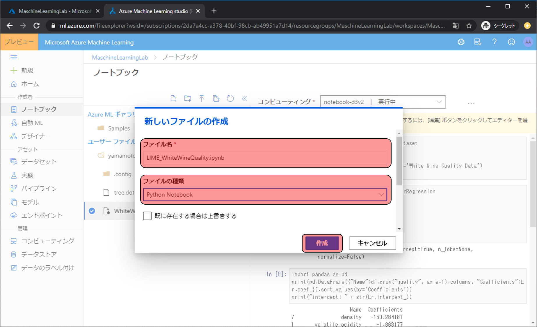ファイル名をLIME_WhiteWineQuality.ipynb、ファイルの種類をPython Notebookにし、作成をクリックします。