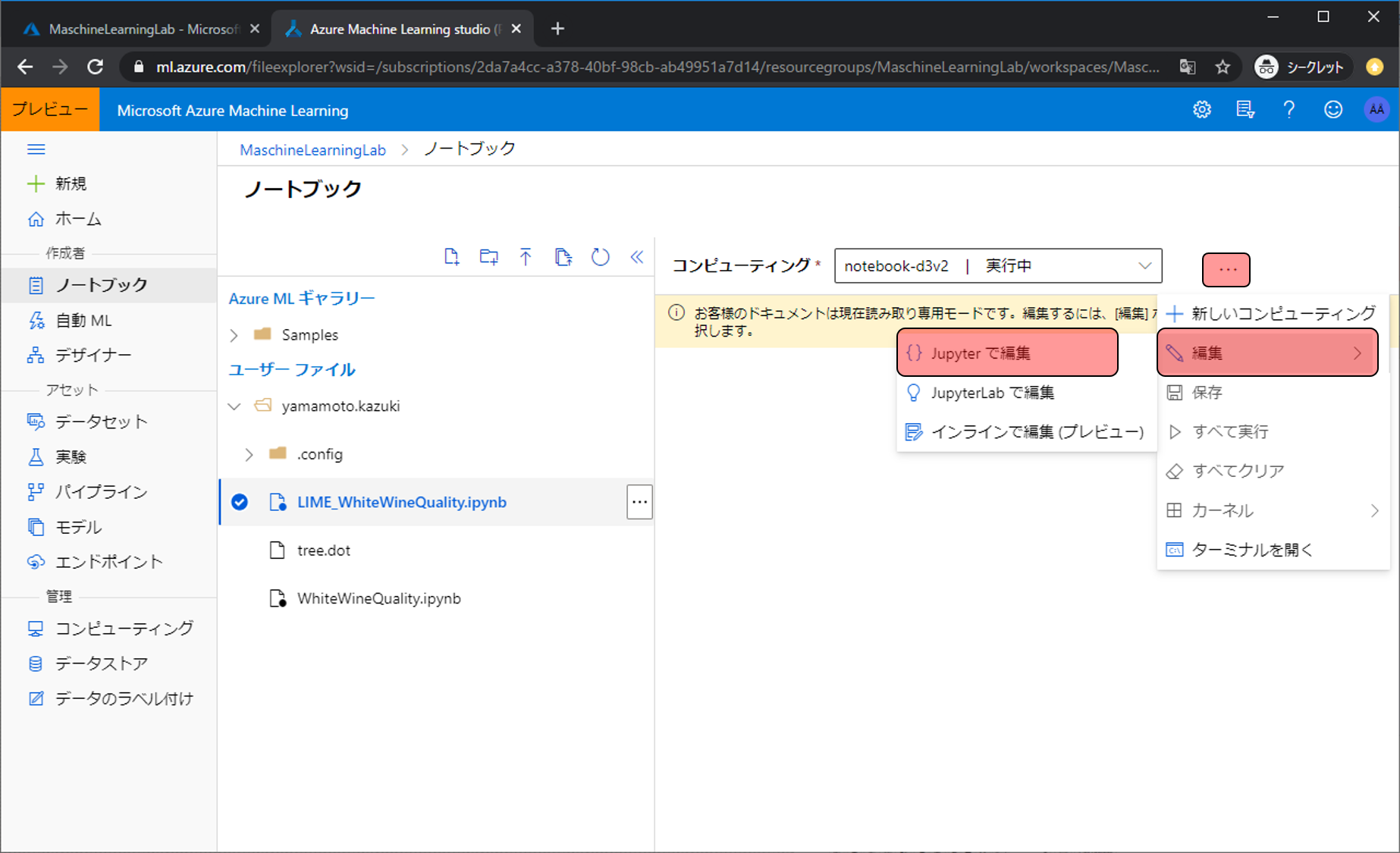 …をクリックし、編集をクリック、Jupyterで編集をクリックします。