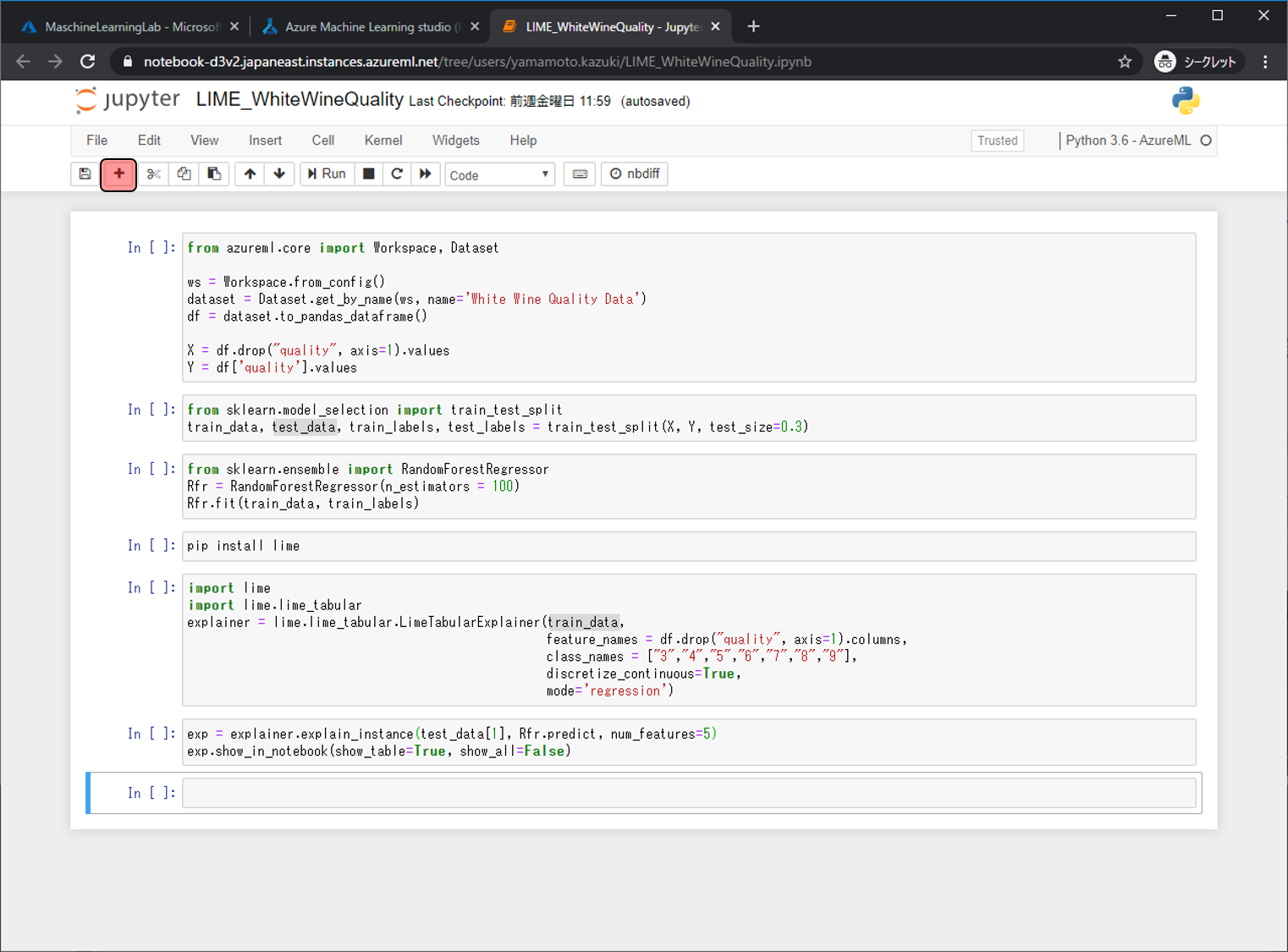 +をクリックすると、空のセルを追加することができるので、上記したコードを1セルに1つづつJupyterに貼り付けます。