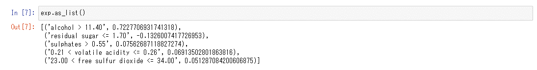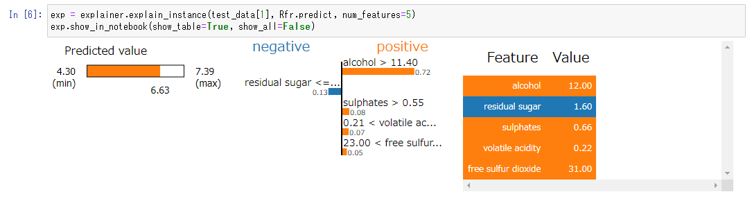 最後のほうに青とオレンジでグラフィカルな情報が出ています。これがLIMEによる解釈の内容です。