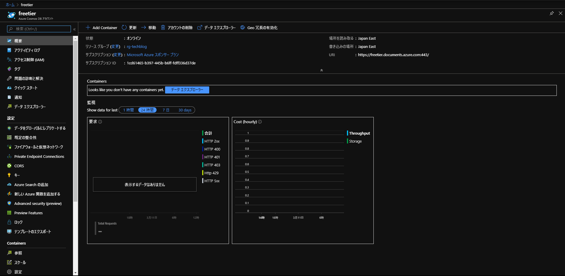 コードを書いてプログラムからデータを操作してもいいですがちょっと面倒そうなのでAzure ポータル上から行えるデータエクスプローラーを使ってみようと思います。