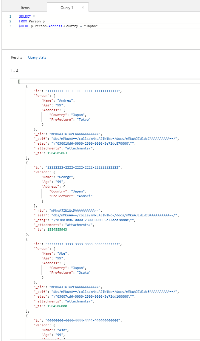 とりあえずPerson.Address.CountryがJapanの人を絞り込んでみます。