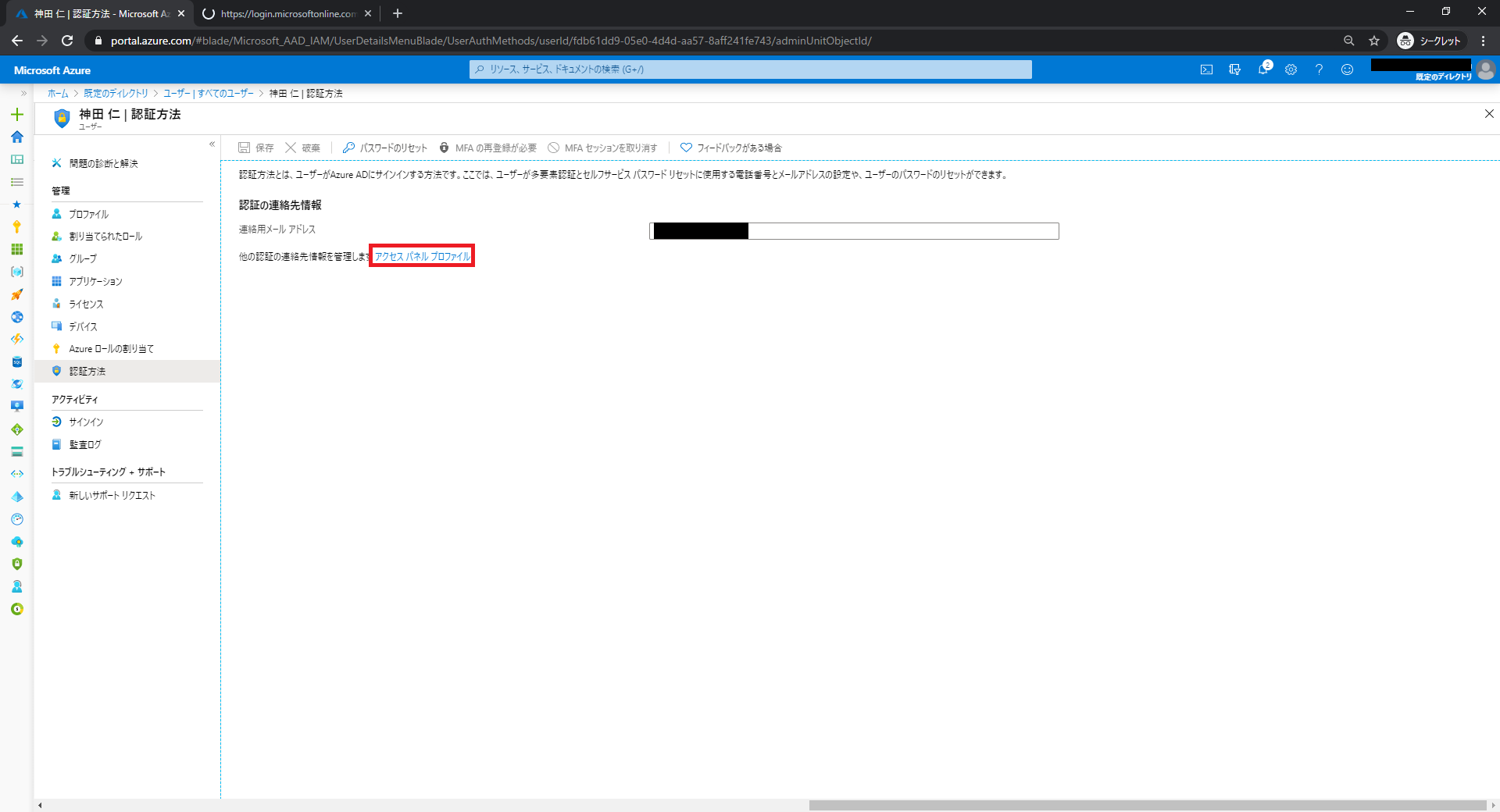 [Azure Active Directory] → [ユーザー]から任意のユーザーを選択し、