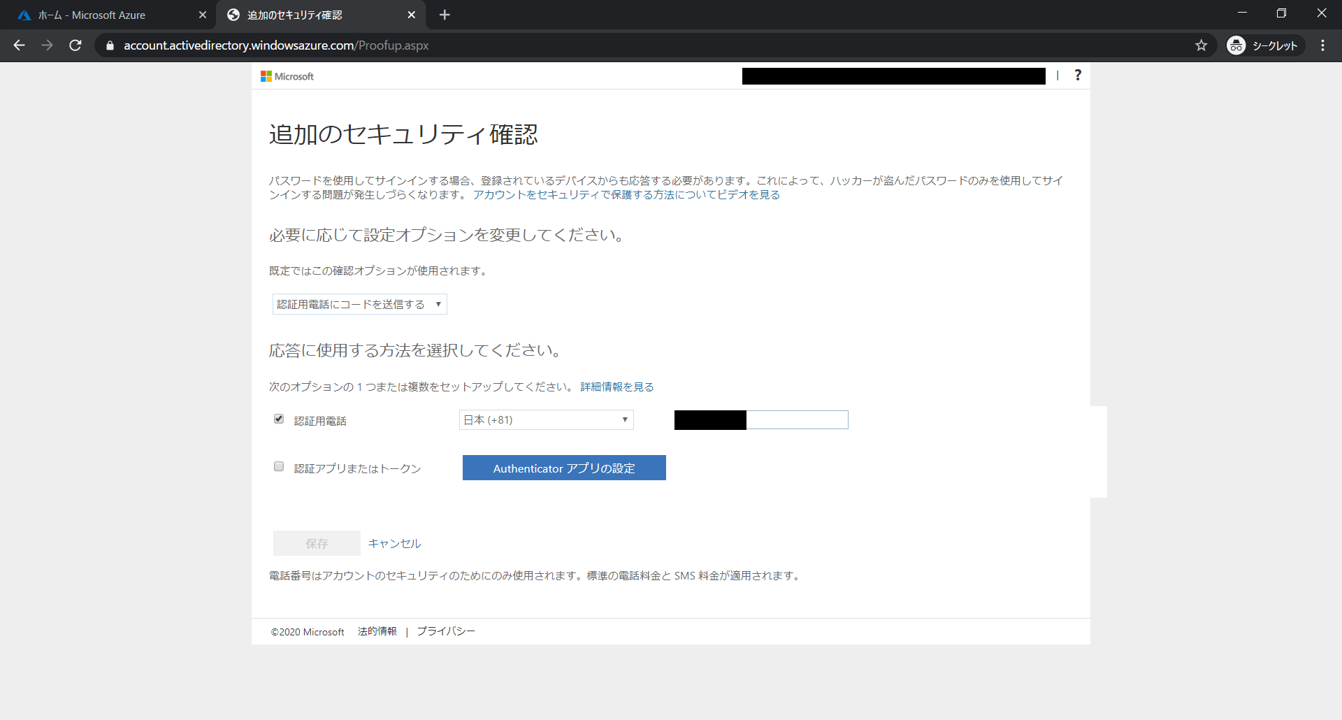 再度、AzureポータルにログインするとMFAが有効になっており、