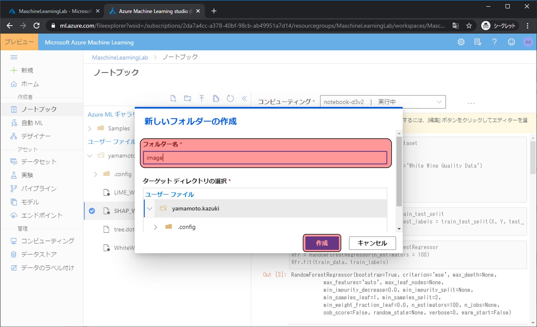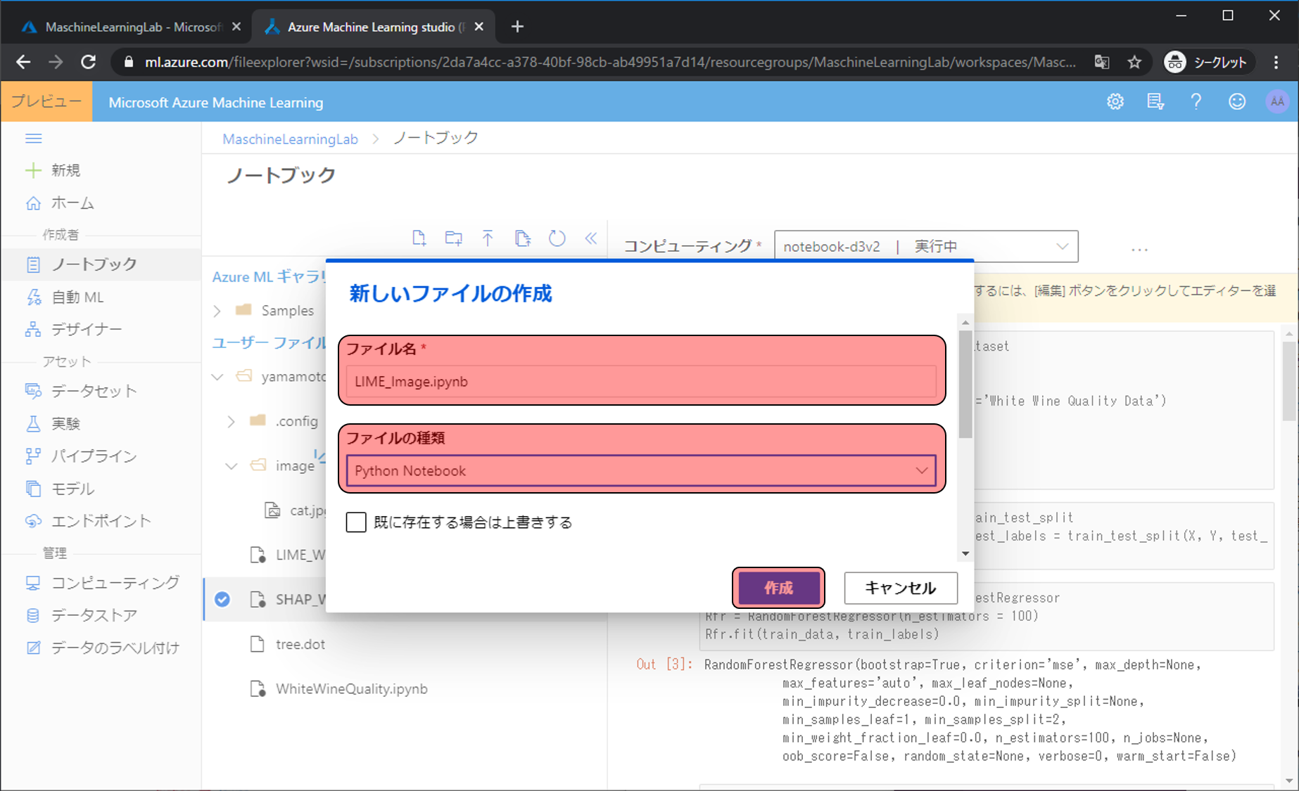 ファイル名をLIME_Image.ipynb、ファイルの種類をPython Notebookにし、作成をクリックします。