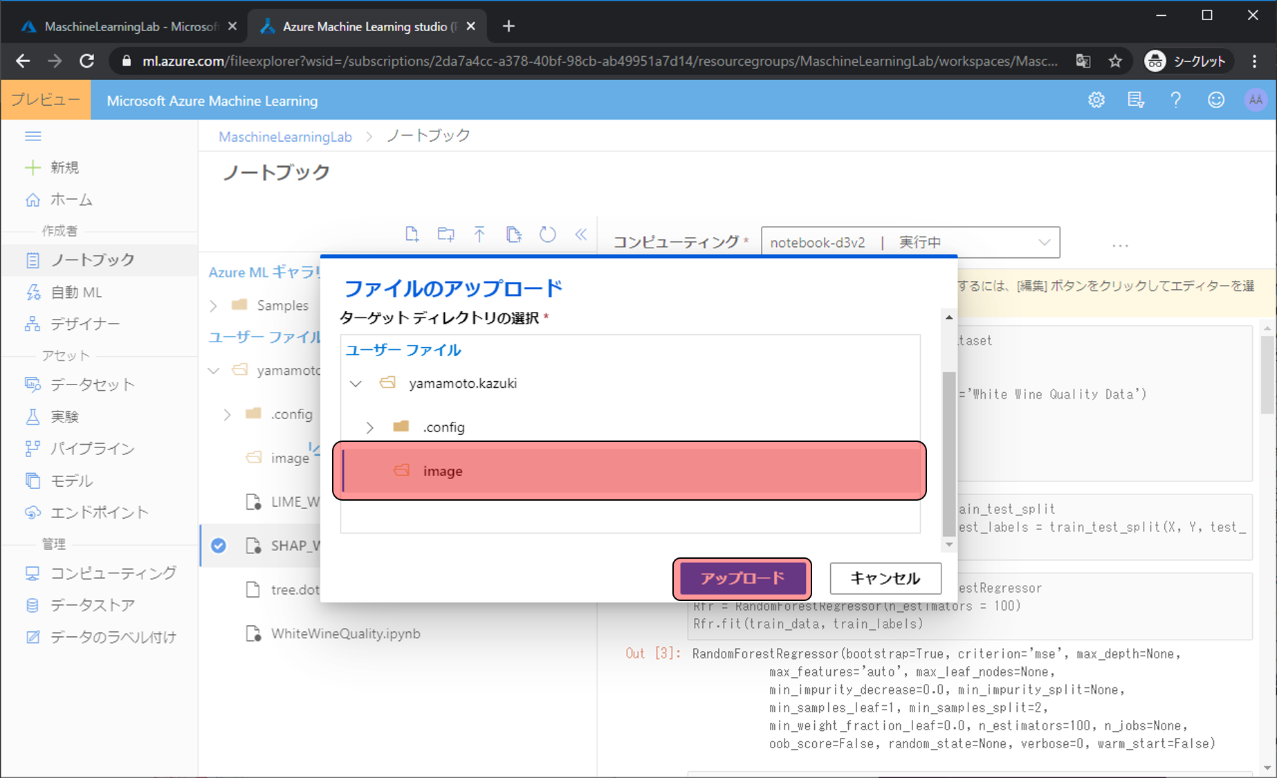 imageフォルダが作られます。続いて分析対象の画像をアップロードします。ファイルのアップロードアイコンをクリックします。