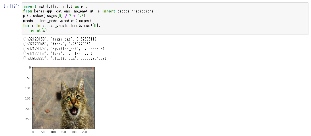 まずは予測結果を見てみましょう。今回の画像では写っているものはtiger_catだと予測していました。合っていそうですね。