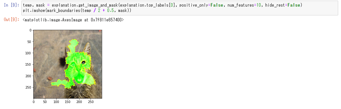 plt.imshow(mark_boundaries(temp / 2 + 0.5, mask))判断結果を求めるのに有益だった箇所を緑色で表しています。今回はありませんが、不益(判断するのに邪魔だった箇所)は赤色で表示されます。