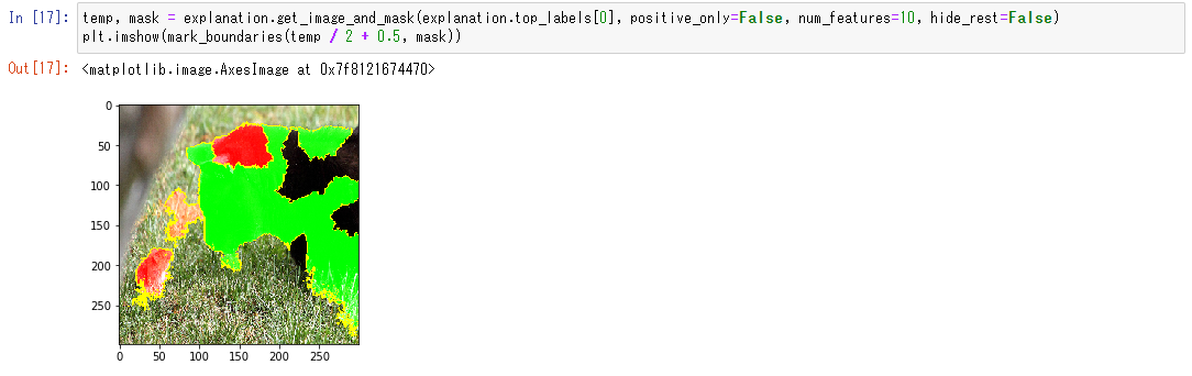 plt.imshow(mark_boundaries(temp / 2 + 0.5, mask))コードをコピペしたら、上から順に実行します。