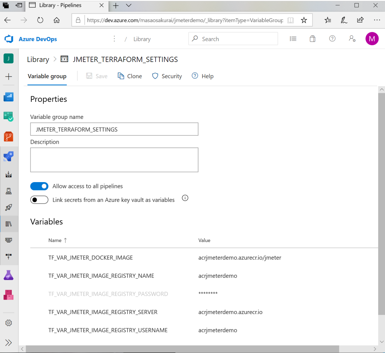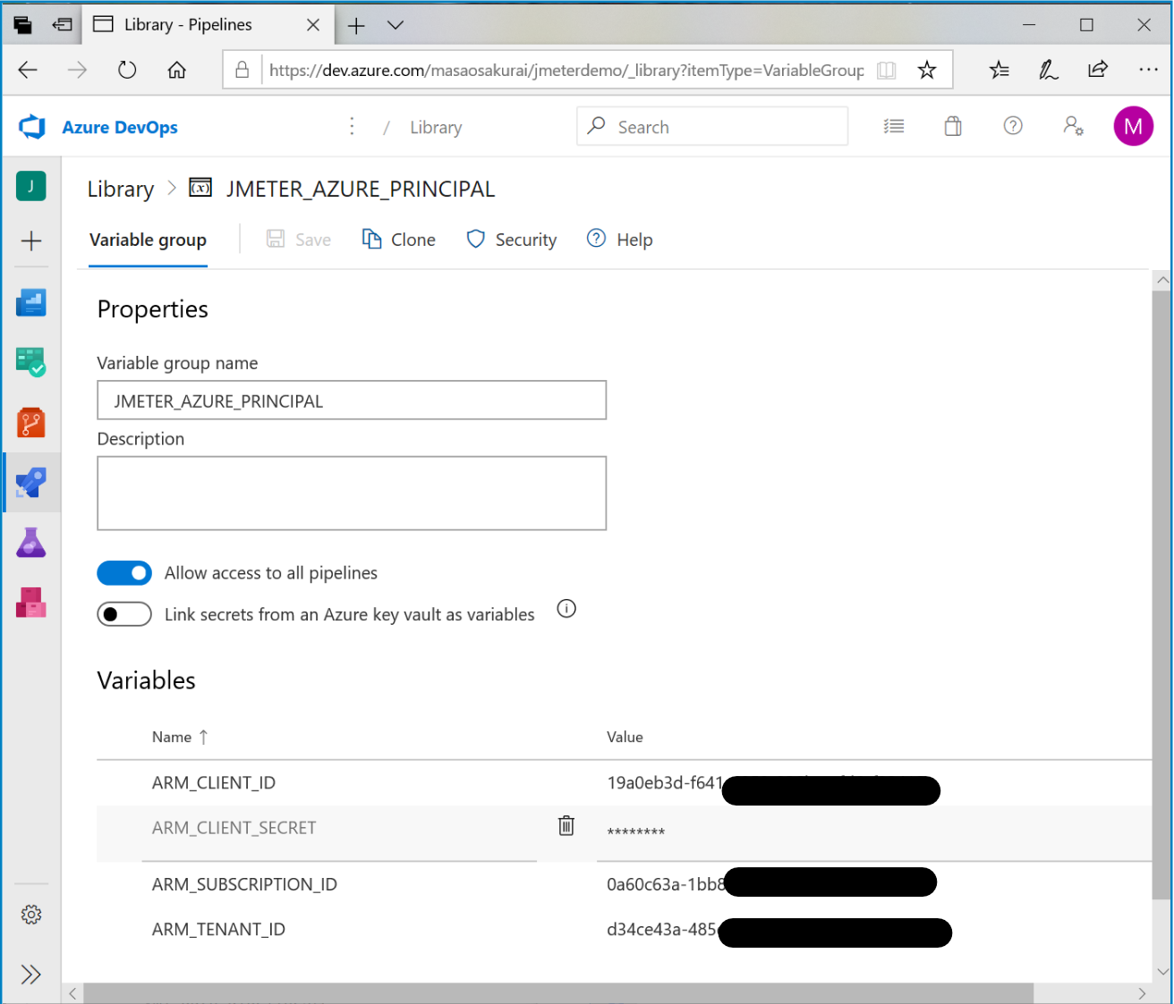--value $CLIENT_SECRETAzure PipelineのLibraryのJMETER_AZURE_PRINCIPALを開くと変数として登録したものと、シークレットとして登録したものがそれぞれちゃんと設定されれていることがわかる。