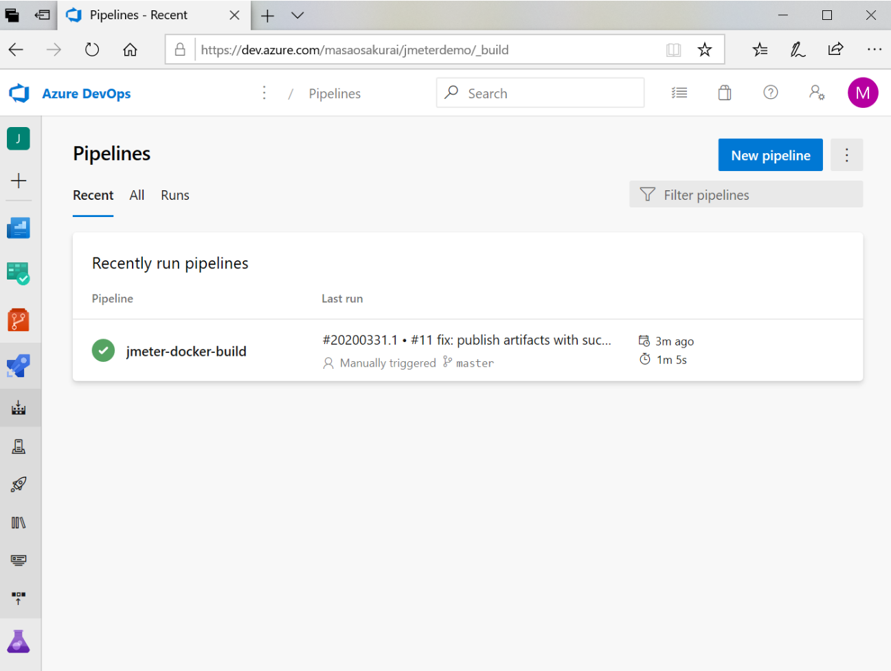 az pipelines variable create --pipeline-name $PIPELINE_NAME_JMETER --name TF_VAR_JMETER_SLAVES_COUNT --allow-overrideパイプラインのALLを選択し、作成したパイプラインを確認する。