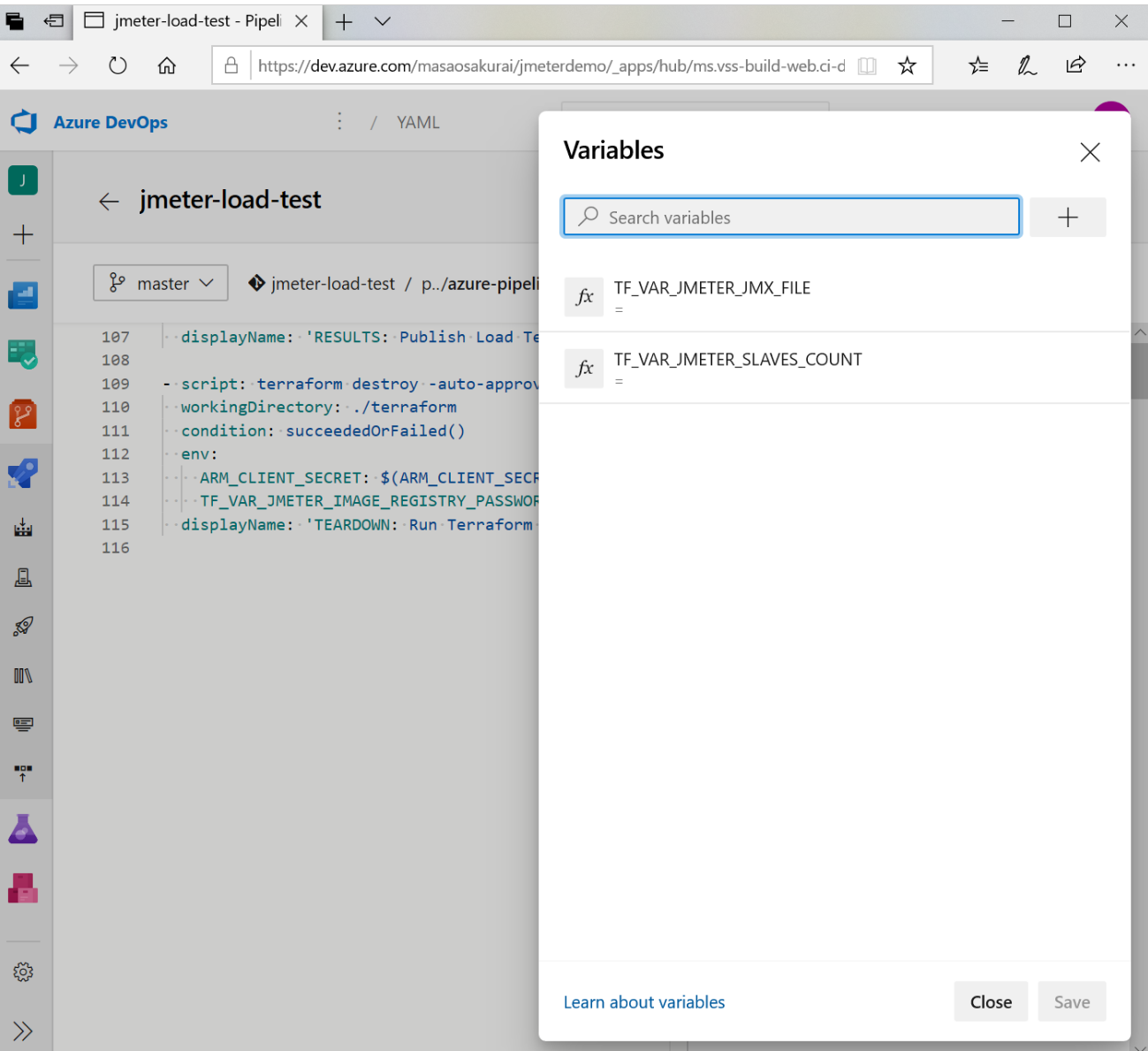 --yml-path pipelines/azure-pipelines.load-test.ymlJMXファイル名、 JMeterスレーブ数を実行時の変数として追加する。