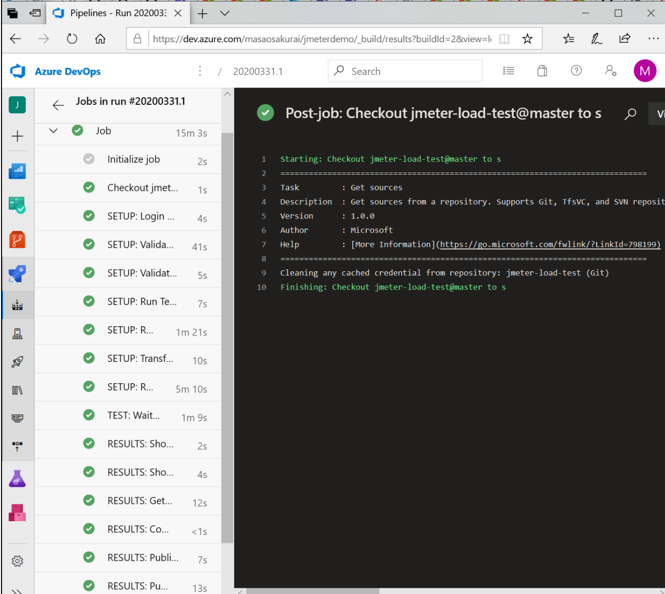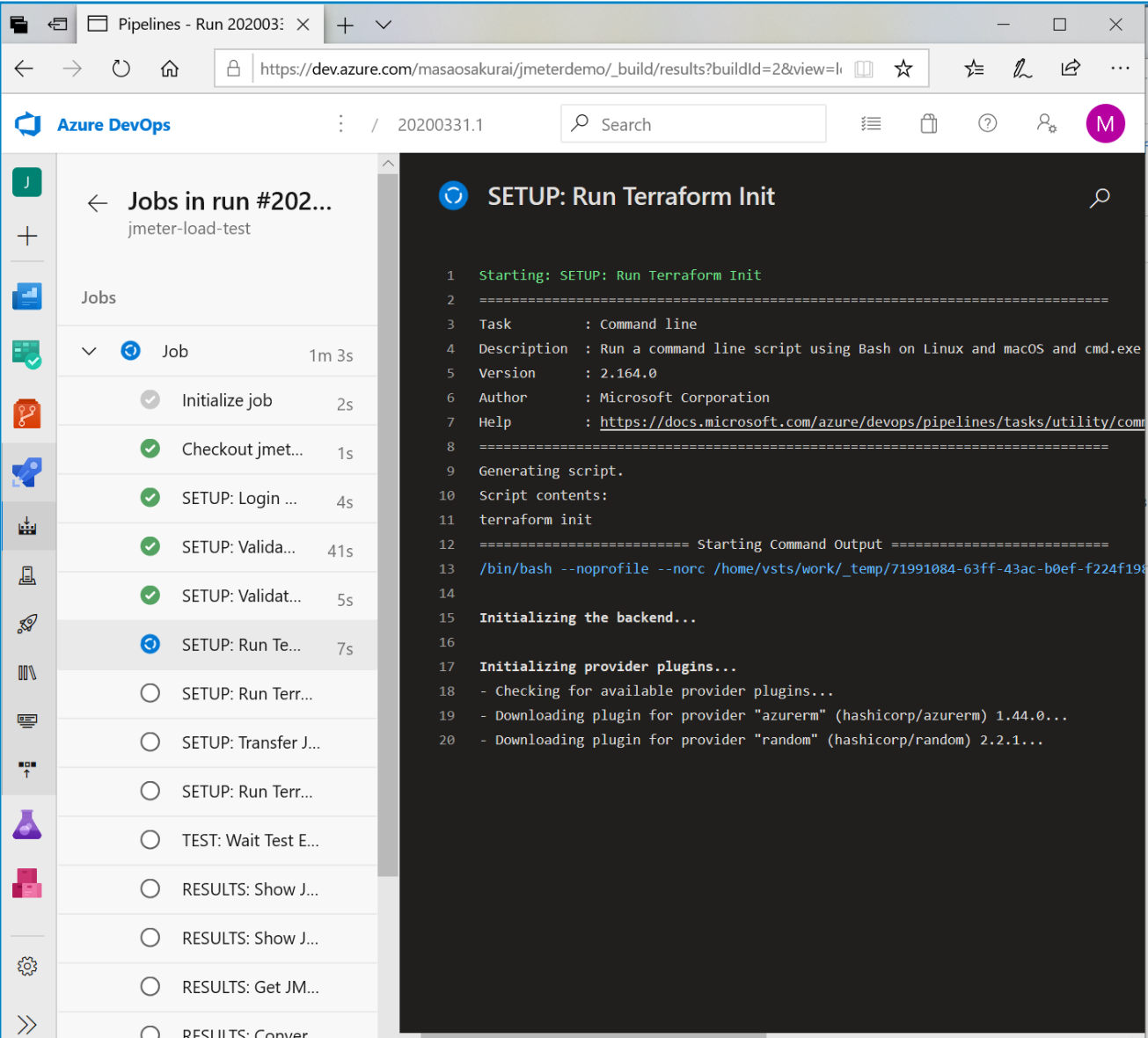 --variables TF_VAR_JMETER_JMX_FILE=$JMETER_JMX_FILE TF_VAR_JMETER_SLAVES_COUNT=$JMETER_SLAVES_COUNTパイプラインのjmeter-load-testの実行ログを参照すると実行中だと実行中のログが参照されます。こちらを見ていると、リアルタイムにコンソールログは表示され実行状態を知ることができます。